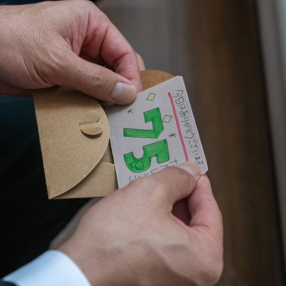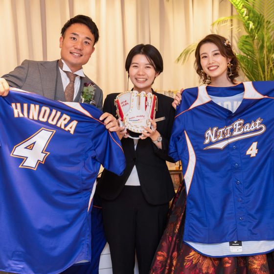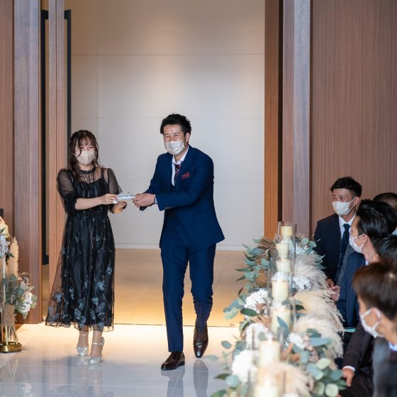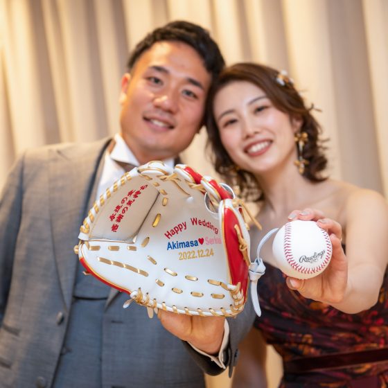 今まで私たちがお世話になった方々が結婚式に参列して下さるだけでも、私たちにとって最高の日になることは間違いないと思っていました。でも、私たち2人が楽しむだけではなく、ゲストみんなで楽しめるようなおもてなしがしたと思い準備を始めました。ウェルカムスペースにエスコートカードを飾り、1人1人に取ってもらいました。その中には、サプライズ用紙が入っており、挙式で指輪の絵が描いてあった方に、リングプレゼンター役になってもらいました。またそのサプライズ演出は続き、披露宴ではスプーン・フォークの絵が描いてある方に、サンクスバイトに出てきてもらいました。あと12月24日ということで、5等まであるくじ引きのクリスマスプレゼント大会もすることができました。私たちも当日まで誰が当たるかわからなかったので、みんなで盛り上がることができたと思っています。