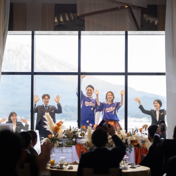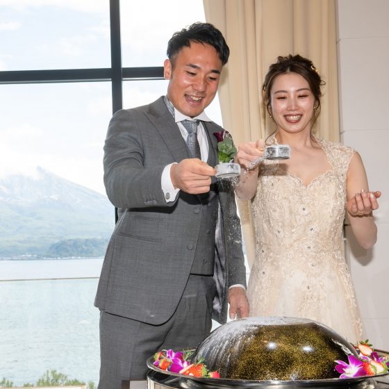コンセプトである「おじゃったもんせ」でお迎えしたいと思っていました。お料理では鹿児島の旬の食材を使用して提供して頂いたり、ケーキではなく桜島に見立てたコーヒーゼリーにパウダーを振りかけて灰に見立てるという降灰セレモニーも鹿児島らしさを演出することができました。結婚式が結ぶと「楽しすぎた」などと喜びの声がたくさん聞くことができたので、本当に嬉しかったです。