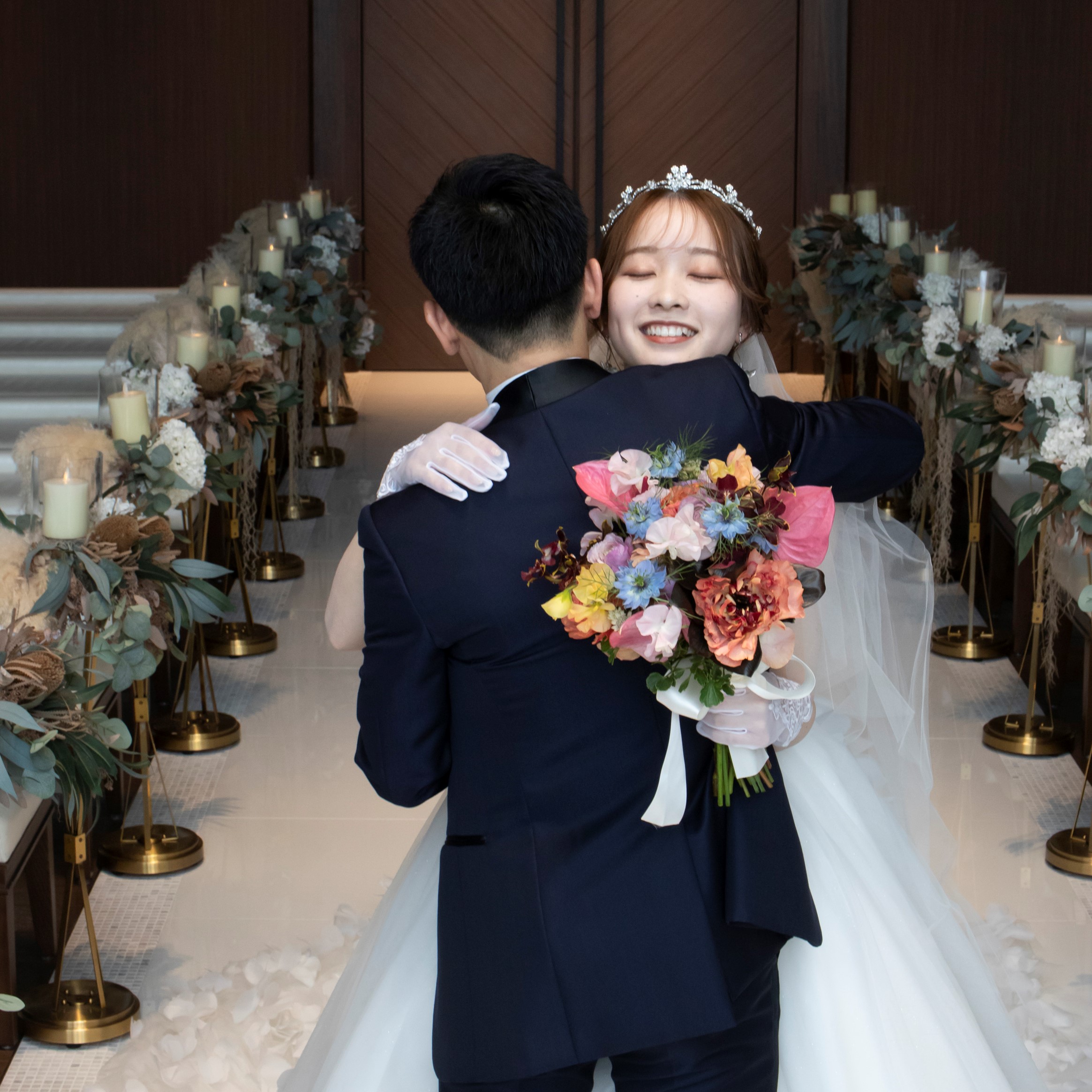 当日は、一日という日が、一瞬で過ぎ去ったように感じました。結婚式経験のある友人からは、事前に「当日は一瞬で終わるから瞬間瞬間を噛み締めて楽しんで」と言われていましたが、まさにそのとおりでした。ゲストの皆さんと顔を合わせるまでは、「みんな来てくれてるだろうか」「無事に結婚式が終わるだろうか」と、少し不安な気持ちもありましたが、いざ式が始まると、そんな気持ちは微塵も感じず、とにかく一瞬一瞬を楽しむことができました。式中は、会場スタッフが付きっきりで先導や声掛けをしてくださり、段取り的な不安もなく、とても安心して過ごせました。何よりも、たった一日だけで、会いたい人皆さんに会えるという状況が、とても不思議で幸せな時間だったのを鮮明に覚えています。そして、ゲストからは、マッピング映像やサプライズのプレミアムブッフェなどで驚きや喜びの声をいただき、自分たちが考えていた「ゲストへのおもてなし」を、少しだけ形にすることができたのではないかなと思います。ありがたいことに、結婚式が終わってからも「いい式だったよ」と声を掛けてもらう機会がとても多く、ザ・ベイスイート桜島テラスで結婚式を挙げることができて、本当によかったです。式場を決めた理由が、担当プランナーの宮本さんでしたが、最後の最後まで私たちに寄り添って真摯な対応をしてくださり、本当にありがとうございました。準備から結婚式までの約9か月間、本当に楽しく打ち合わせや結婚式準備ができました。また、当日対応してくださった全てのスタッフの方々のお陰で、後悔は全くなく、理想どおりの結婚式となり、一生に一度の最高の思い出ができました。 結婚式終わりには、ゲストの方々にチオビタドリンクをお配りしましたが、これからも、自分たちに関わる全ての皆様に愛情満タンで恩返しをしていけるように頑張りたいと思います! 愛情満タン!チオビタドリンク!!
