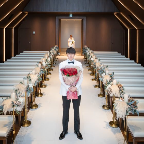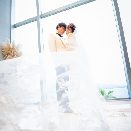 そして、桜島からとても近くて道路を挟んでいないので外を見ると綺麗な海が広がっていて、チャペルもガラス張りでとてもオシャレな造りになっていて綺麗でした。会場も白がいいとずっと思っていて式場の会場が白一色だったのでそこにも惹かれました。なによりディズニー大好きな私達は階段入場に憧れていたので階段入場もできたので嬉しかったです。
