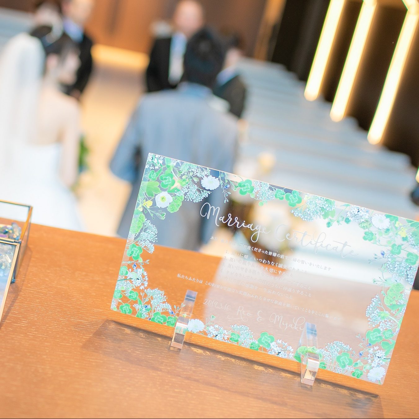 挙式は「人前式」のスタイルにしました。ゲストのみなさんに立会人となっていただき、私たちの幸せな人生のスタートを見守ってもらいたかったからです。また、「ふたりの人生の始まり」をテーマにしたかったので最初から "ふたり" で登場しました。結婚証明書はチャペルともぴったりなガラスの証明書にしたり、オリジナルの誓いの言葉を作ったり。短い時間の中にも自由度の高い内容を取り入れることができました。