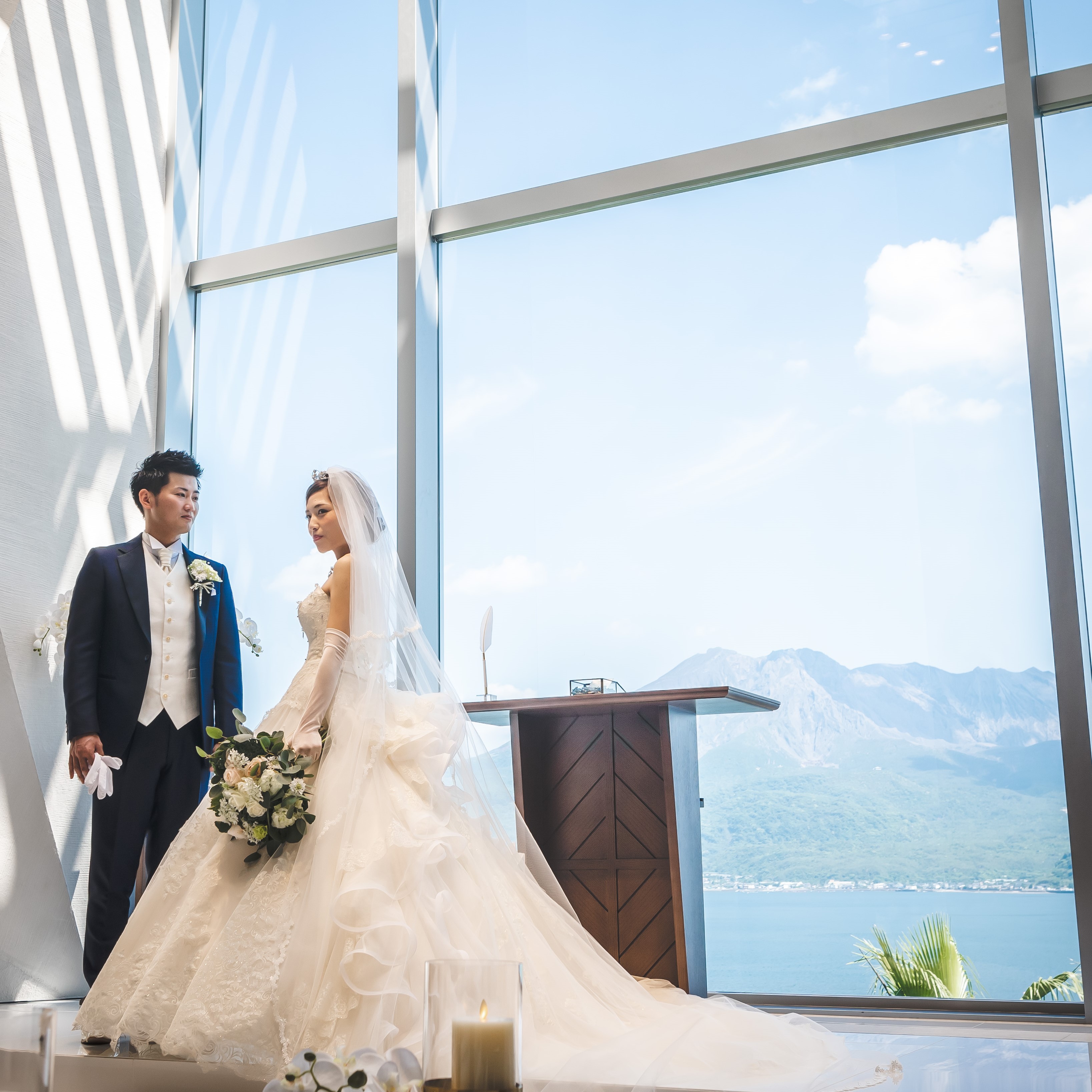 私たち2人が大好きな海、そして鹿児島の原風景、桜島を見渡せる式場で