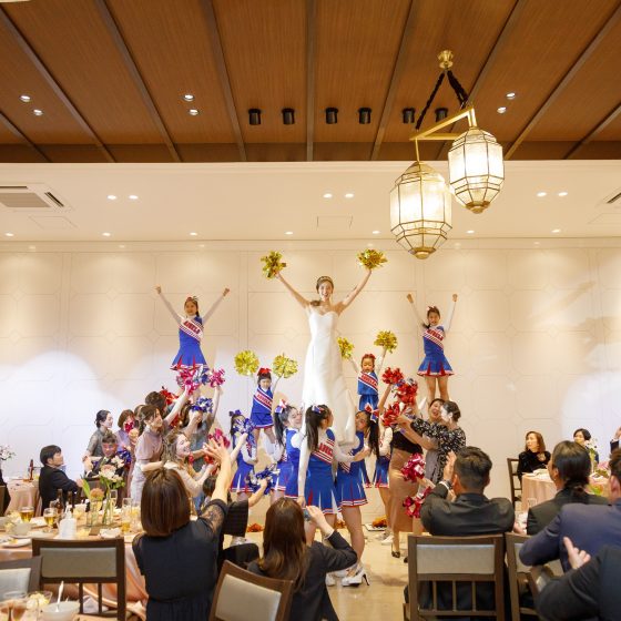 余興の母校のチアリーディングの演技では、旦那さんにサプライズで新婦も少しだけ参加しました。