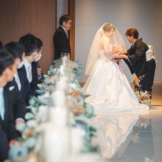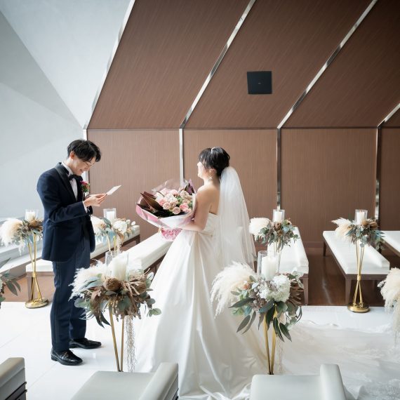 挙式会場の扉が開いた瞬間にゲストの方々が目に入り、こんなにも多くの方々に集まって頂けたことに感動しました。同時にだいぶ緊張もしており表情が固くなっていたように思います。