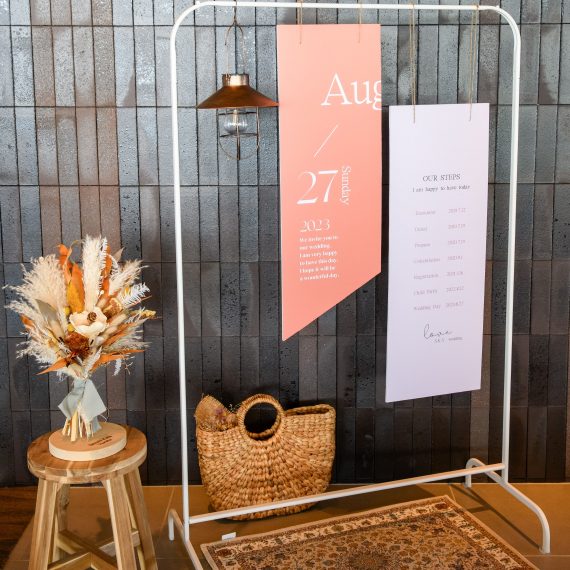1つ目はDIYアイテムです!ウェルカムスペースにはハンドメイドアクセサリーを置きました。普段からピアスなどを作るのが好きでゲストに喜んでもらいたくて頑張りました。プロフィールブックには佐賀と鹿児島のおすすめスポットを記載し、それぞれの魅力を伝えました。他にもウェルカムボードや席次表などいろいろなものを手作りしました!育児、仕事をしながらの準備は大変でしたがとても楽しかったです!