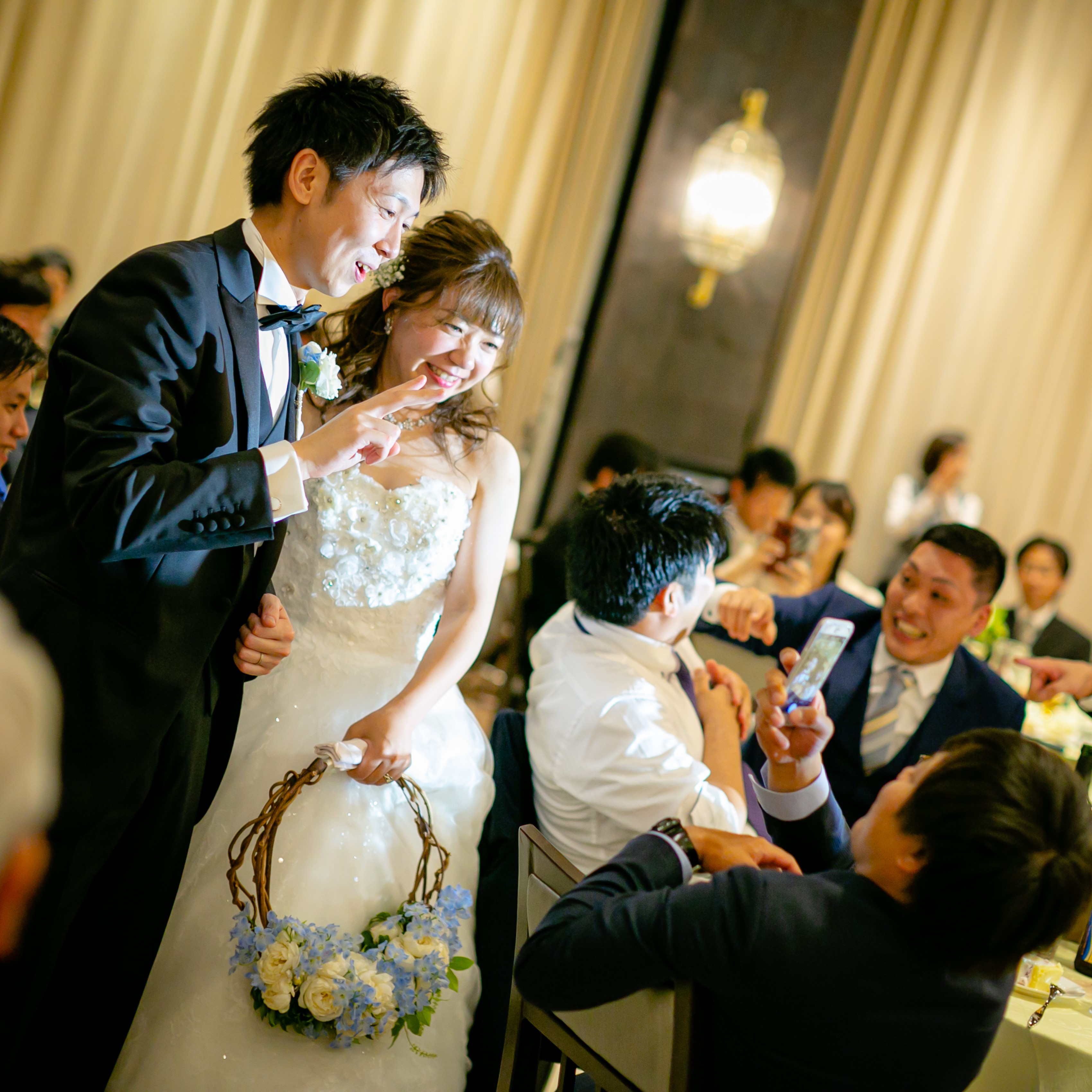式中は、メリハリを意識し、砕けるところはとことん!という感じで、常に式中はゲストの方々が笑顔を絶やさぬよう、司会の方にもお手伝い頂き、アットホームな雰囲気を作って頂きました。テーブルフォトラウンドでゲスト卓一つ一つを回って写真を撮り、また、話をする時間もあり、緊張せず普段通り楽しむことが出来ました。