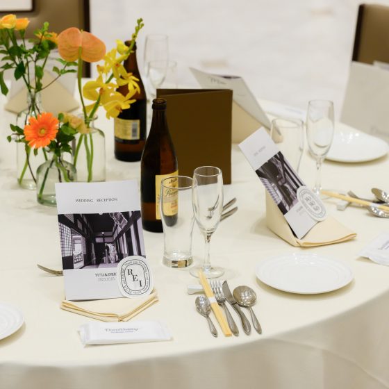 ウェルカムスペースは1番最初にゲストが入ってくる所だったので統一感を出すように気をつけたのと、ウェディングキャンバスは絶対にしたかったので結婚証明書の文字も頑張って書きました。どんな感じになるかはギリギリまで分からなかったので完成したのを見ると凄く上手に出来てて感動しました。披露宴会場では空き時間に皆んなが楽しめるようにゲストとの写真を沢山いれたプロフィールブックを作りました。幼少期当てクイズの時にみんながプロフィールブックをみながら探しているのを見たりすると作って良かったと思いました。