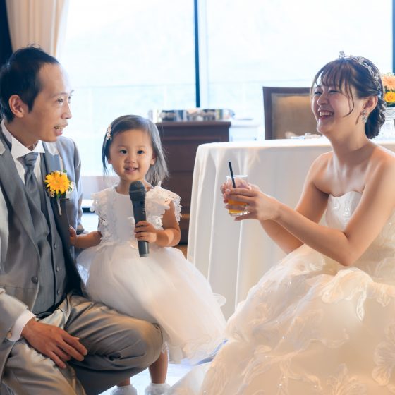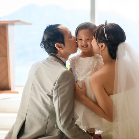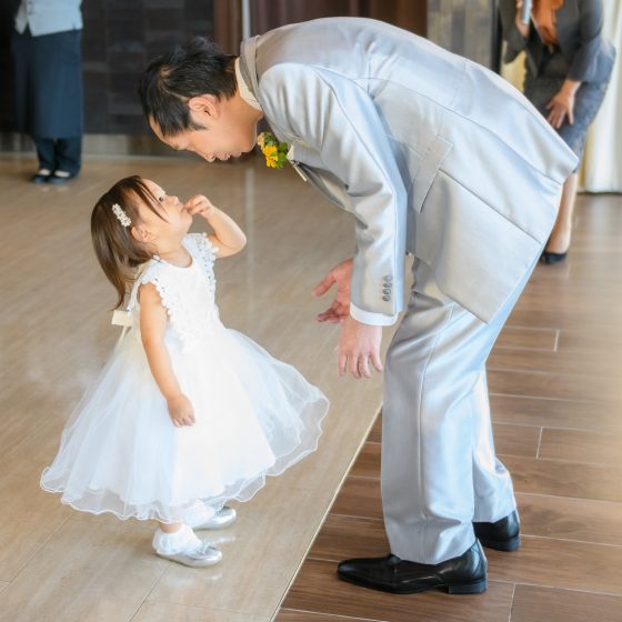 あとは、私たちには2歳の娘がいたのですが、式当日にはスタッフさんの指示に従ったり、私たちがいなくてもスタッフさんと待てるようにと場所見知りや人見知りをしないよう、あえて毎回打ち合わせには連れていきました。そのおかげか式場は楽しい場所だと来るたび嬉しそうで、当日も1日ご機嫌で過ごすことができ、担当のプロデューサーさんには特に懐いていてグズることなく、しっかりとお役目を果たし、終始ニコニコで式を終えることが出来ました。