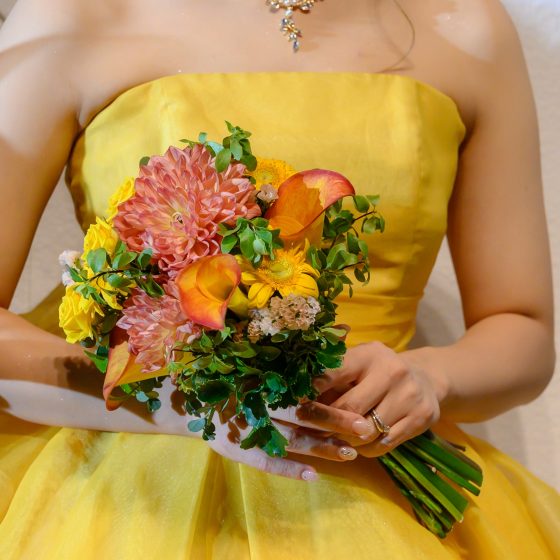 最初は式のイメージが沸かず、こだわりなども全く思いつかなかったのですが、担当の西さんと進めていくうちに少しずつこういう式にしたい!と自分なりのイメージが出来てきました。コロナ禍で出来ていなかった両家家族の顔合わせも兼ねての式だったので、ゆっくり話ができるようステージでの余興はしないことにしました。その分全員で参加できて盛り上がるような、ドレスの色当てクイズ・ウエディングツリーでの結婚証明書作成を行いました。また親族紹介にも時間をかけたり、美容師をしている妹にお色直しを手伝ってもらったり、娘にリングガールや乾杯の挨拶をしてもらったりと、新郎新婦だけではなく参列してくれる家族も目立つようなイベントをお願いしました。
