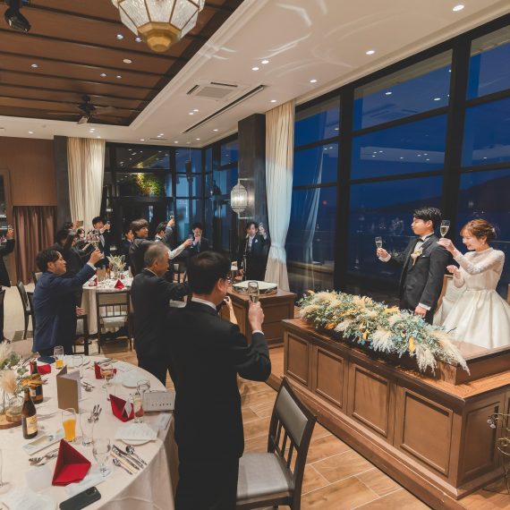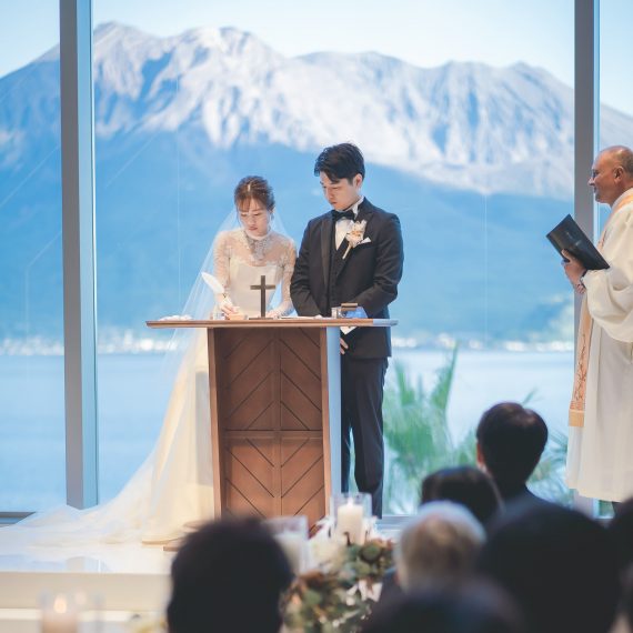 当日は新郎新婦共に緊張が残る中ではありましたが、式場スタッフの皆様、そして来場していただいた皆様のお陰で素晴らしい結婚式、披露宴になりました。桜島の見えるロケーションと料理については列席していただいた皆様からの評判がよく、ここで結婚式をしたいと言ってもらえる方々も多くいらっしゃいました。