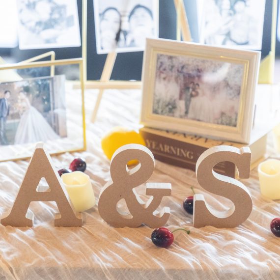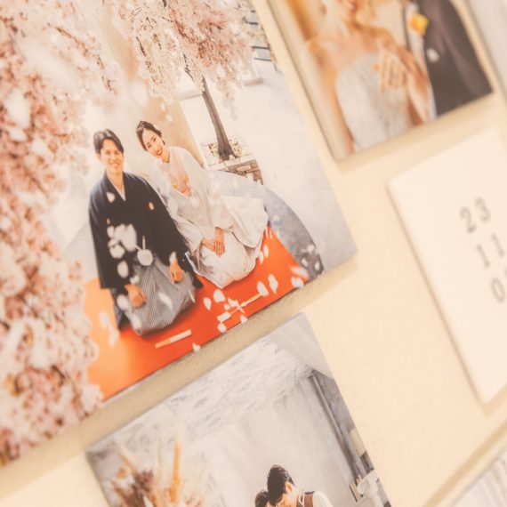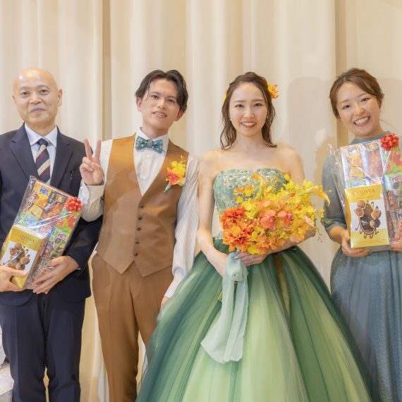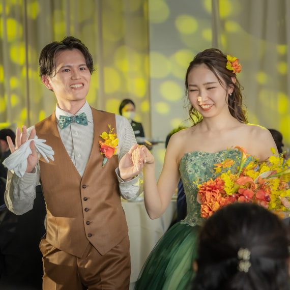 披露宴会場はカラフルにしたかったので装花はオレンジ、イエローをメインにお願いしました。目を引く大きなオレンジのダリアや秋らしさも入れたかったのでコスモスを入れました。カラードレスをグリーンにしたのでイメージは花畑でした。ウェルカムスペースには前撮りの写真を絶対に飾ろうと決めていたのでフォトパネルを作成し、壁に飾りました。また、披露宴ではゲスト参加型のイベントを入れたかったので友人へのサプライズバイト、幼少期クイズをしました。幼少期クイズは、自分達の幼い頃の顔写真を用意し、「この顔は何をしている時の顔でしょう?」と少し変わったクイズにしました。料理は県外からのゲストも多かったので、鹿児島の鶏飯やカンパチのお茶漬けなどをぜひ食べてもらいたかったのでプレミアムブッフェを付けました。打ち合わせの初めの頃は自分達の結婚式のイメージがなかなか出来ず、そんなにこだわることはないかも?と思っていましたが、担当プロデューサーの山本さんと打ち合わせを重ねていくうちに1つ1つこだわる結果になりました。