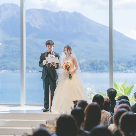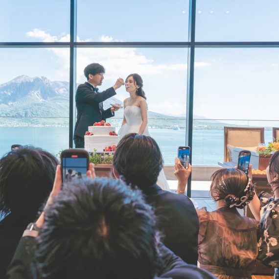 初めてのブライダルフェアで、THE BAYSUITE SAKURAJIMA TERRACEに行かせて頂きました。料理がとても美味しく、特に鰻とフカヒレの茶碗蒸しが絶品でした。来てくれる家族や友人にも美味しい料理を食べてほしいと思い、THE BAYSUITE SAKURAJIMA TERRACEを選びました。そして、1番の決め手はプロジェクションマッピングです。プロジェクションマッピングにはとても憧れがあり、自分たちの結婚式では取り入れたいと思っていました。実際の会場でプロジェクションマッピングを見た時、とても感動したことを覚えています。演出にはこだわりたいと考えていたため、この式場で結婚式を挙げたい!と思い、THE BAYSUITE SAKURAJIMA TERRACEを選ばせて頂きました。
