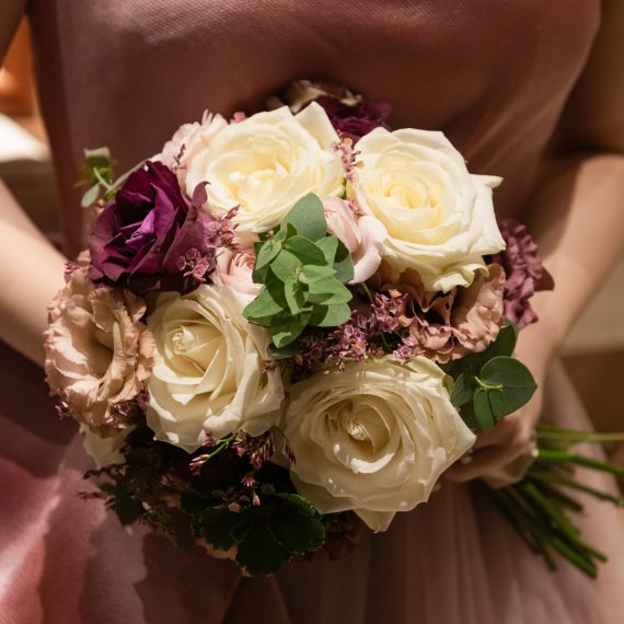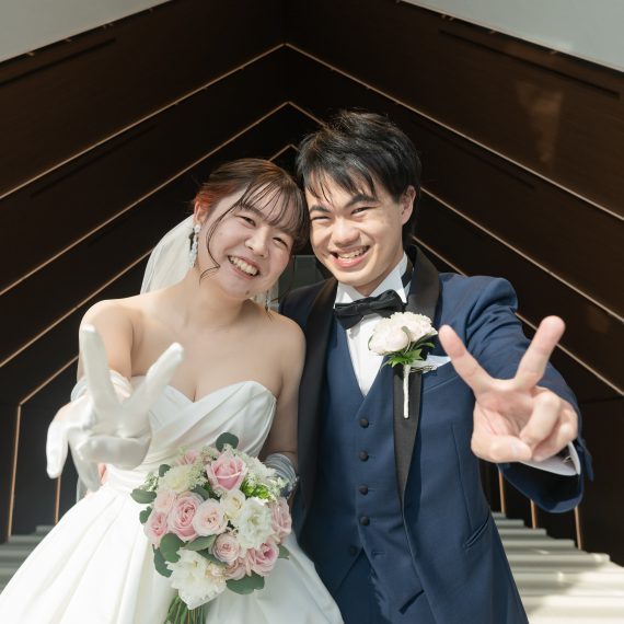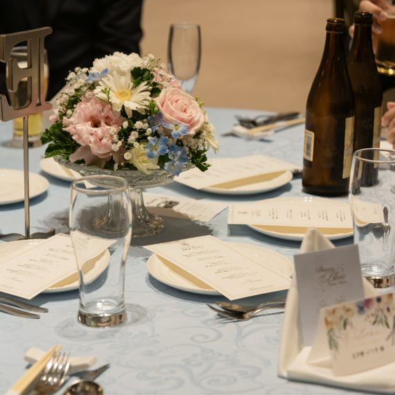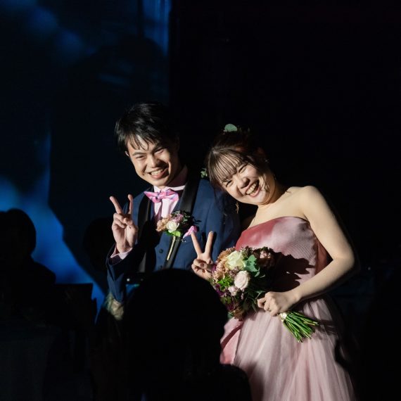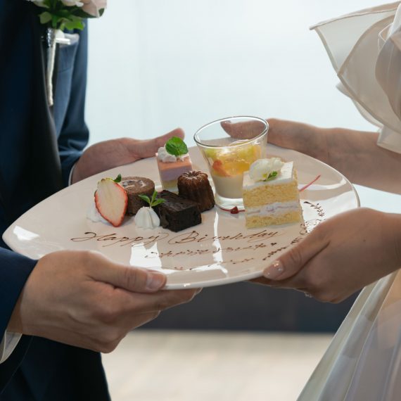 少人数での結婚式で出来るだけ招待した人達と話をしたり、写真を撮ったりふれあいの機会をたくさん披露宴中に作りたい、でもケーキ入刀やファーストバイトしたい、プロフィールムービーも流したいとやりたい事を詰め込んだ披露宴でした。更に式当日の次の日が新郎の誕生日でサプライズも考えていると相談し、ファーストミートをすることとサプライズケーキを準備することになったのですが、どのような流れでサプライズをする事がいいのか悩んでいたら担当プロデューサーの山﨑さんからの提案でどうにか形にする事ができました。当日まで成功するか不安でしたが、山﨑さんや式場のスタッフさん、そして招待した人達のおかげで無事成功させる事が出来ました。
