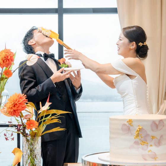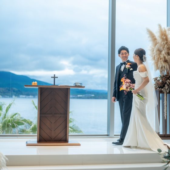 鹿児島の象徴である『桜島』が、チャペルや披露宴会場から一望できるというところが1番の魅力でした。チャペルでは、桜島や海が綺麗に見え、美しい生演奏のなか挙式が執り行われるところが気に入っています。披露宴会場は白を基調としており、お花や衣装などが映える会場となっているところが気に入っています。また、料理は地元の食材を生かしたメニューとなっており、ゲストの方にも満足していただけるのではないかと思ったからです。
