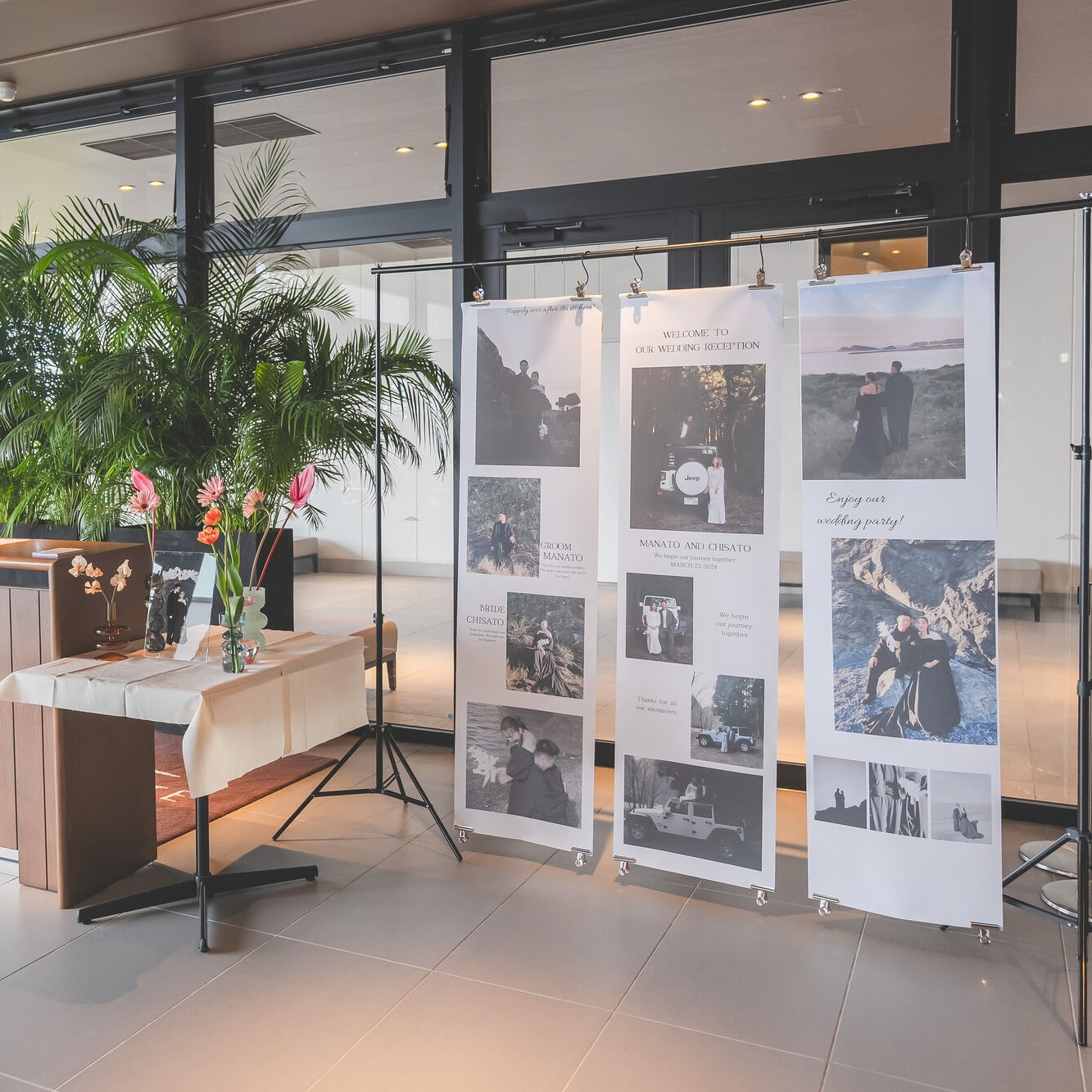ウエルカムスペースは、タペストリーを大きく飾りたくて、そのタペストリーも自作しました!プロフィールブックや席札もかなりこだわりました!