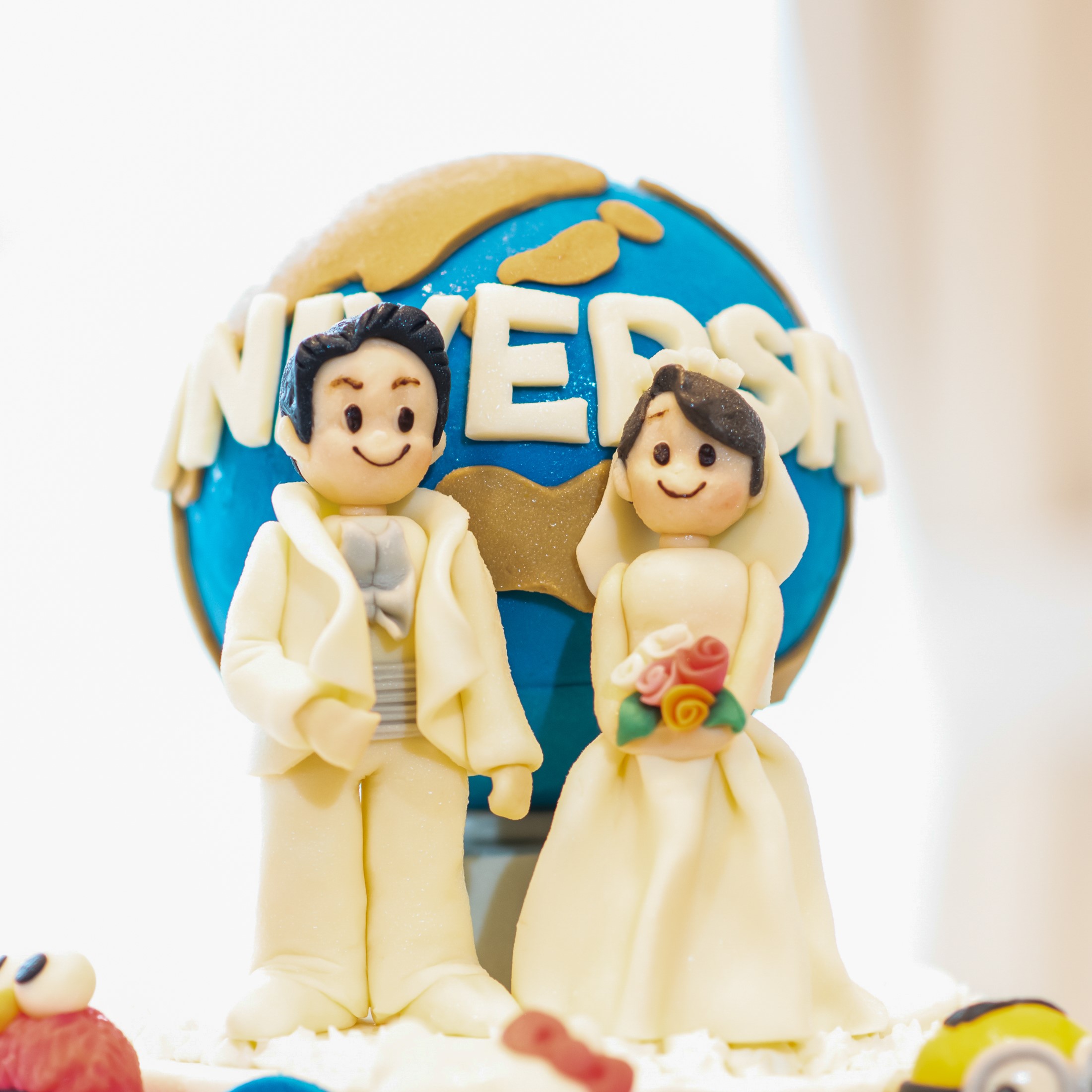 ケーキの上に地球儀とキャラクターと新郎新婦の人形を載せて頂き