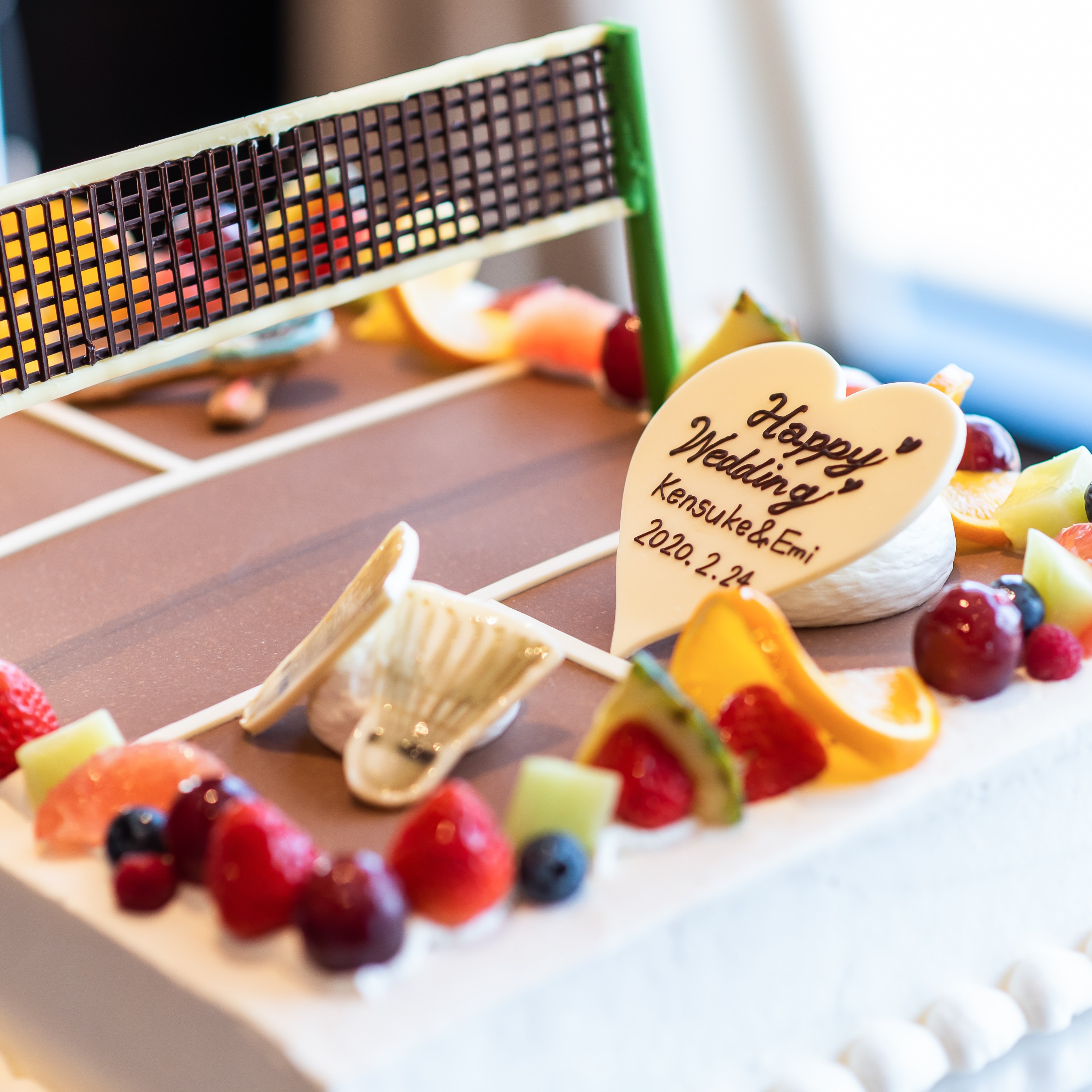 ウエディングケーキは事前にバドミントンコートのケーキにしたいとイメージを伝えていましたが、想像以上に素敵なウエディングケーキで感動しました。