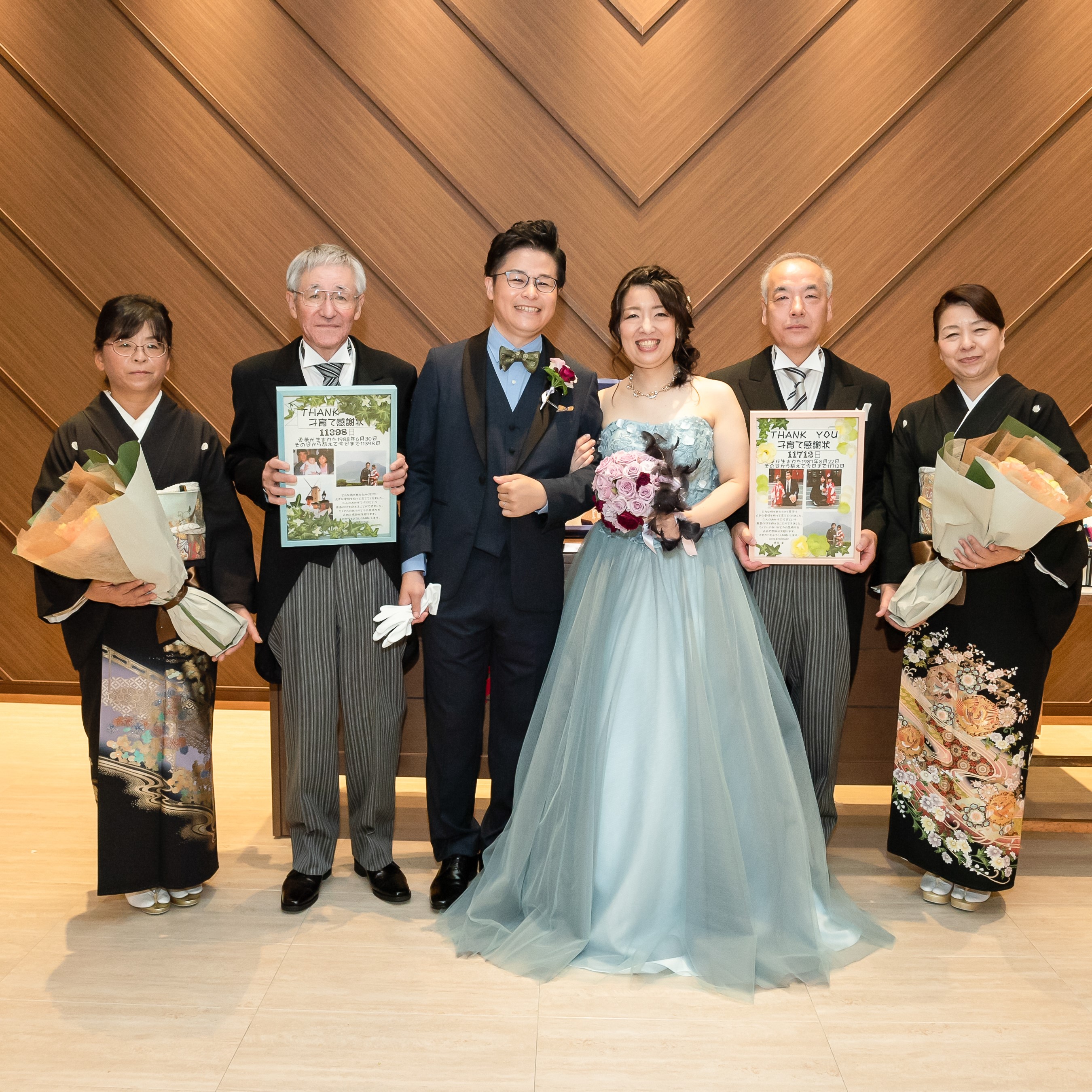 両親へは今まで育ててくれた感謝の想いを届けるために、子育て感謝状を花束と共に贈りました。どちらの実家にも大事そうに今でも飾ってくれています。