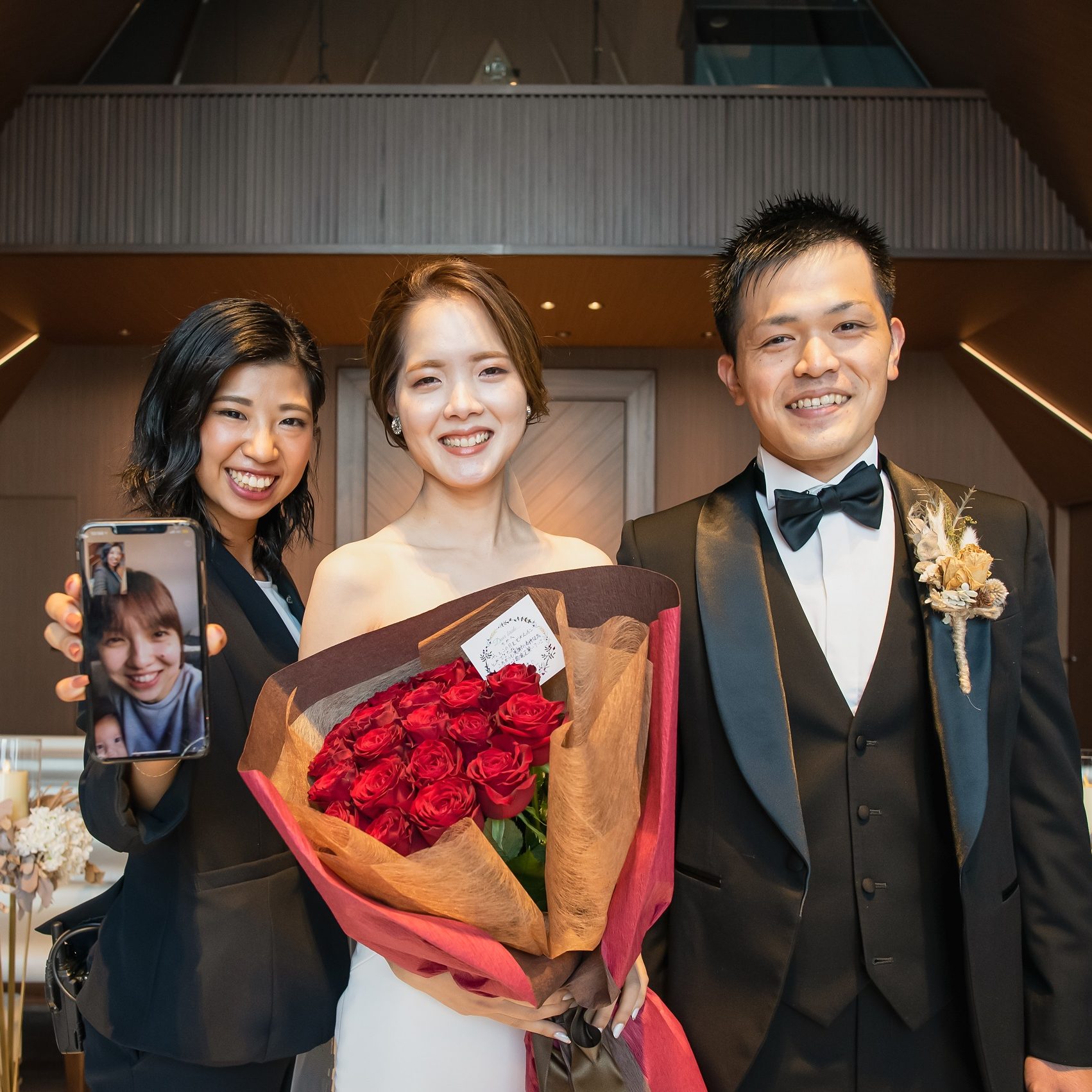 そして、ファーストミートの数分後、、、。プランナーさんが誰かにテレビ電話を繋いでくださっており、そのテレビ電話の相手がまさかの最初のプランナーさんで驚きと嬉しさで緊張感が一気にほぐれ涙が溢れました。私たちにとって、お二人は大好きなプランナーさんです!