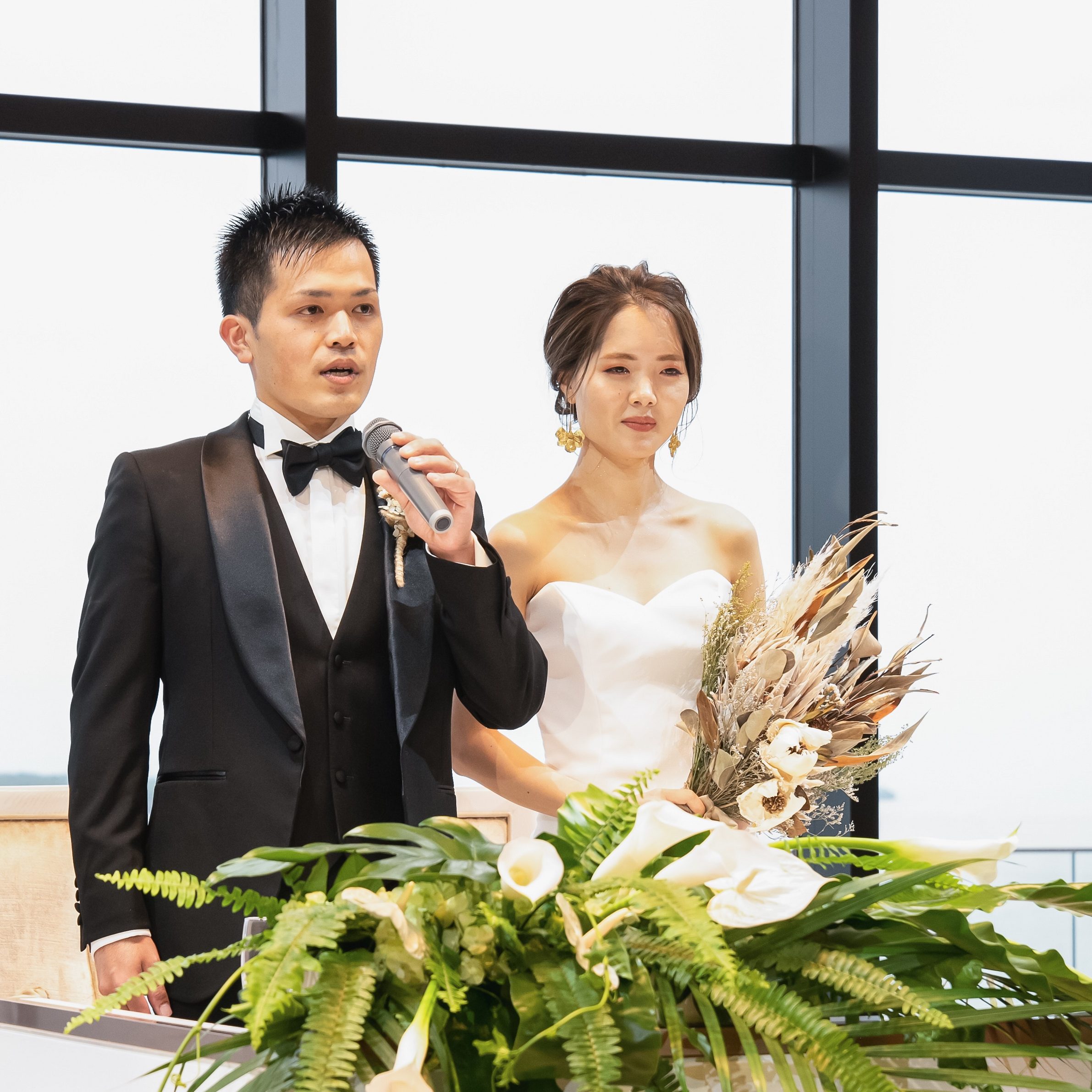 装花は地元「南国」をイメージしました。当日、どのような仕上がりになっているのか楽しみにしてた1つですが、緑×白の組み合わせが会場の雰囲気とも合い、満足の仕上がりでした。また、料理は郷土料理の鶏飯を追加したり、ゲストの方に合わせたお肉の焼き具合にしたりとお打ち合わせで細かく要望を聞いていただき、当日はベイスイートさんならではの美味しい料理を提供することができました。