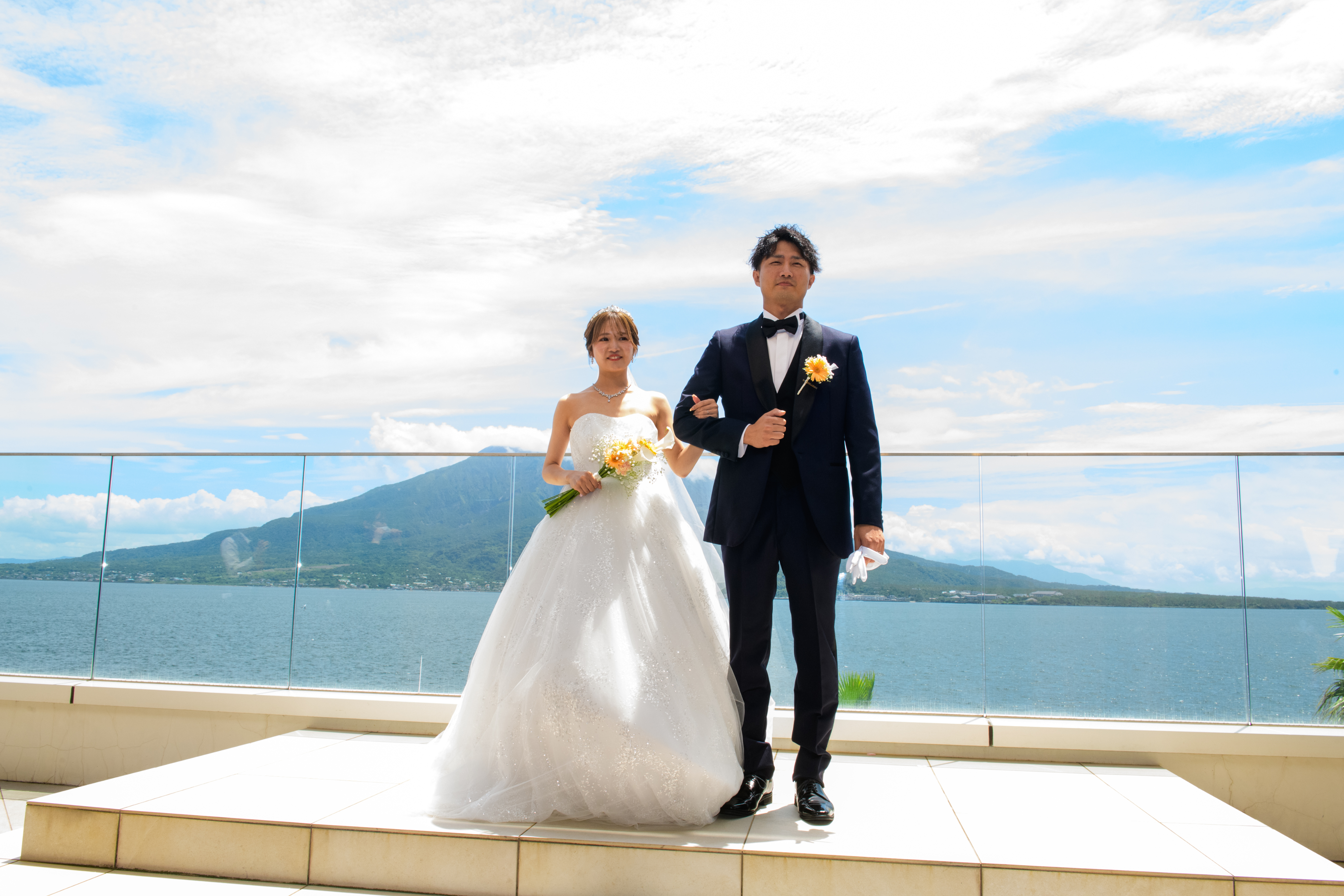新郎様より 奥さんのドレス姿を当日まで見ておらず、対面した時にほんとに綺麗で、その姿がザ・ベイスイート桜島テラスの会場とすごくマッチしていて感動しました。 1日の全てにおいてスタッフひとりひとりが私たちのサポートに全力を注いでくださり、他の会場であげたわけではありませんが”鹿児島ナンバーワン”の式場だと感じました。 人生で一度きりの結婚式をザ・ベイスイート桜島テラスであげることができ、ほんとに良かったです。是非友人に勧めたいと心から思いました。 新婦様より 天候の影響で当日ゲストの方がみんな参列できるか不安でしたが、天気も当日は日が差して桜島もチャペルから綺麗に見えて気持ちも晴れやかに迎えることができました。 また次はゲストとしてもザ・ベイスイート桜島テラスに来てみたいと思いました。