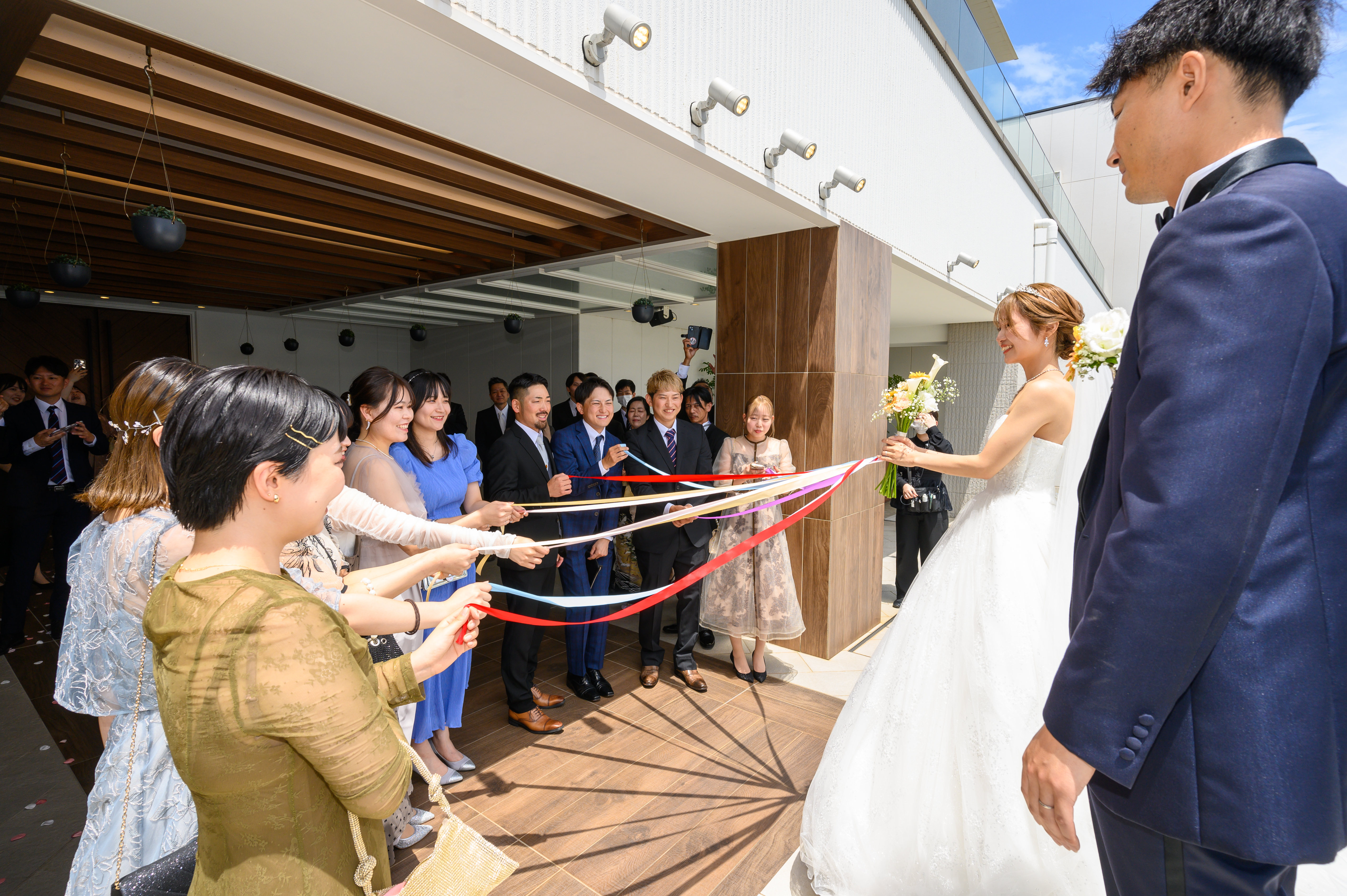 挙式後のブーケトスでもゲスト参加型として、先着10名様にリボンを引いていただき、ブーケを引き当てていただく方にプレゼント、と1日を通してゲストの皆様にもご参加いただきながら全員で楽しむ1日でしたね。