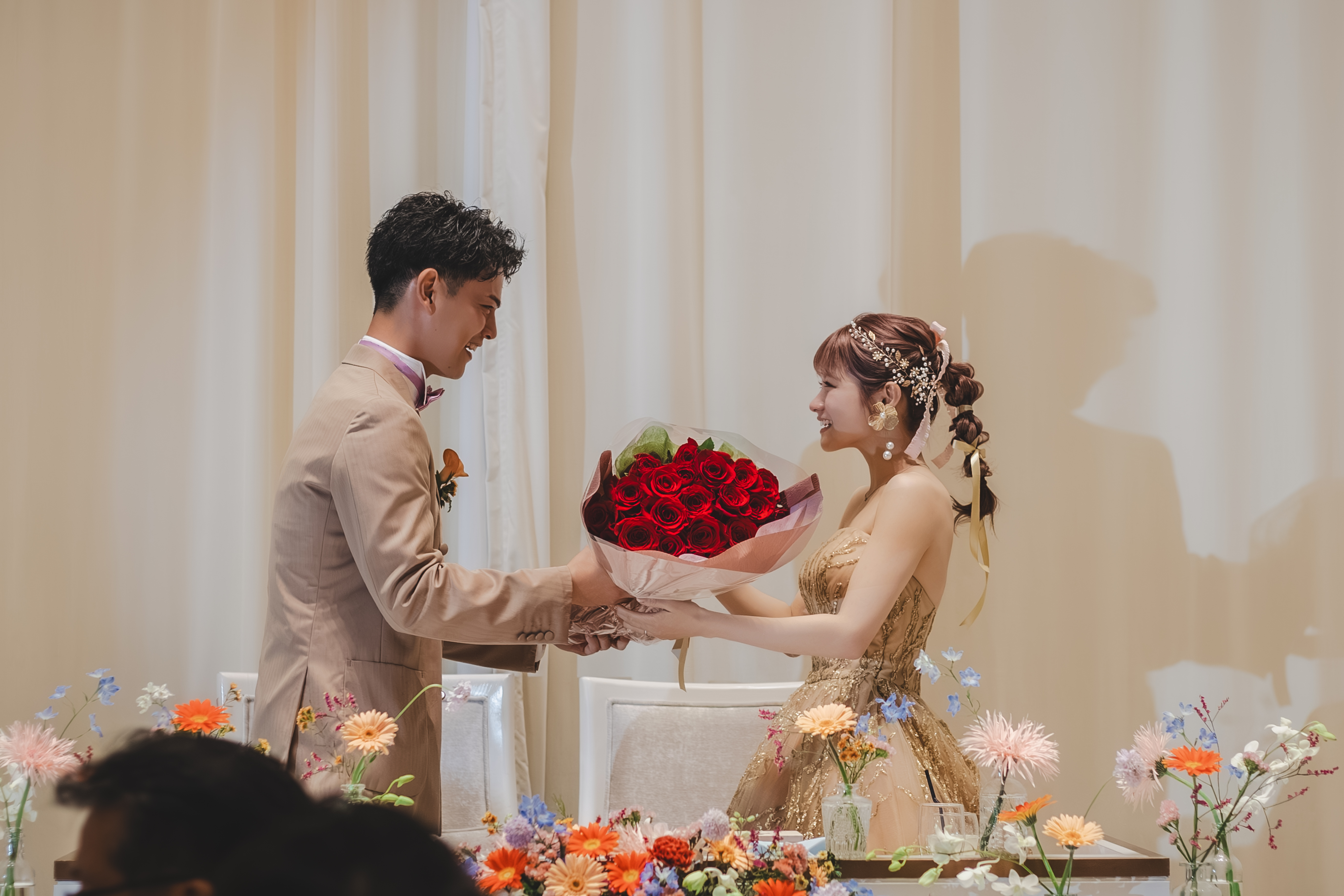 映像が結び、扉から登場した新郎様の手には、各地で集めた「想い」がひとつになった大きなバラの花束が。映像から飛び出してきたような演出で、新婦様へ真っ直ぐに贈られたプレゼントでした。
