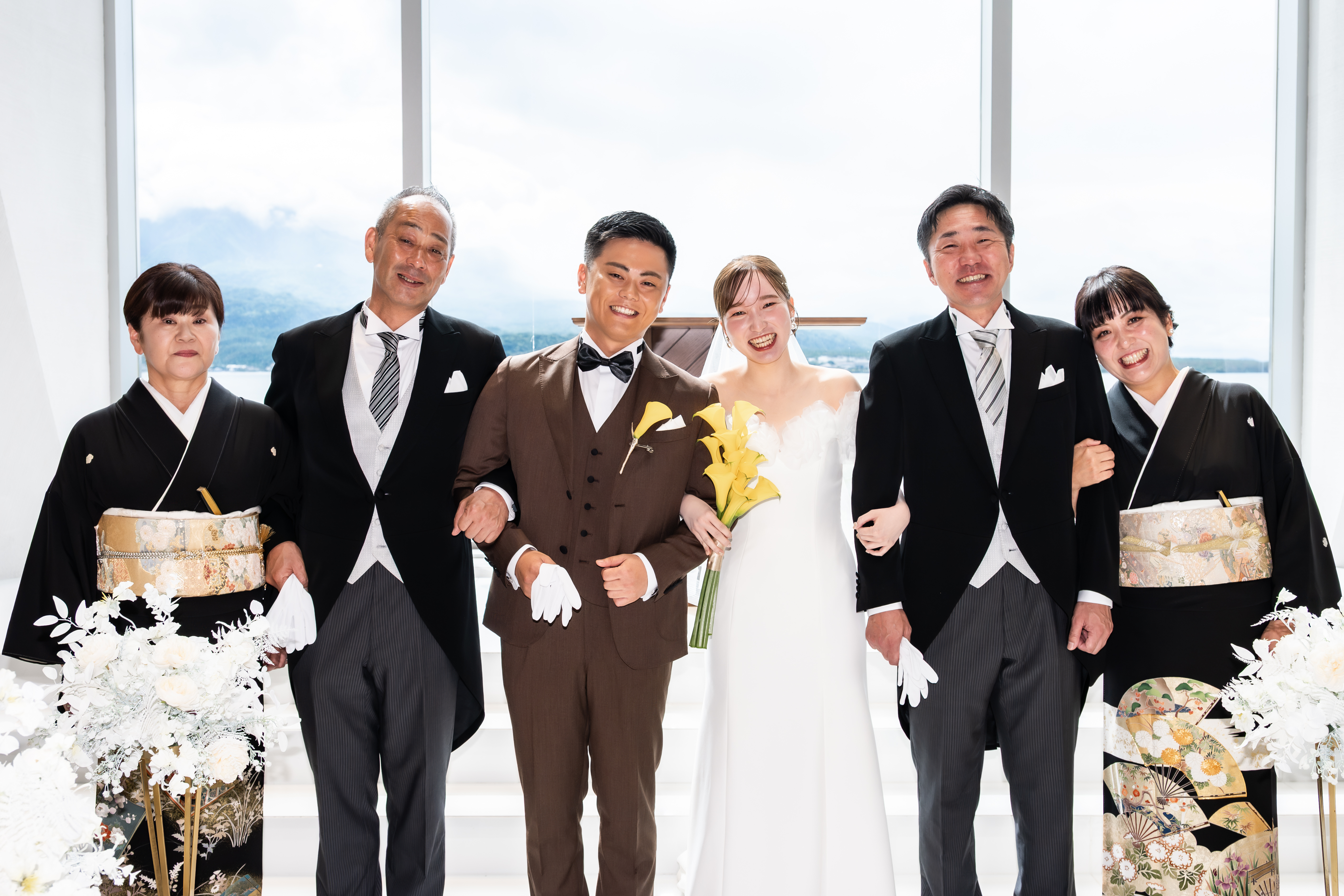 当日は、ビックリするほどあっという間に過ぎて、楽しさと同時に結んだ瞬間ふたりして寂しさが込み上げてきました。 1日を通して、サプライズがあったり、ゲストの方々と写真を撮ったり、お話したりする時間もあり、来ていただいた方々への”感謝”の気持ちも伝えることができたような気がします。 このような楽しい1日になったのも当日まで沢山エスコートしてくださったプロデューサーの川端さんをはじめ、ザ・ベイスイート桜島テラスのスタッフの皆さまのおかげです。 こうして大勢の方々の前に立ち、祝福の言葉をいただける機会は、結婚式が最初で最後だと思います。 そんなかけがえのない時間、貴重な日を、大好きなTHE BAYSUITE SAKURAJIMA TERRACEで過ごすことが出来て本当に幸せです。 心からそう思える事ができた1日でした!