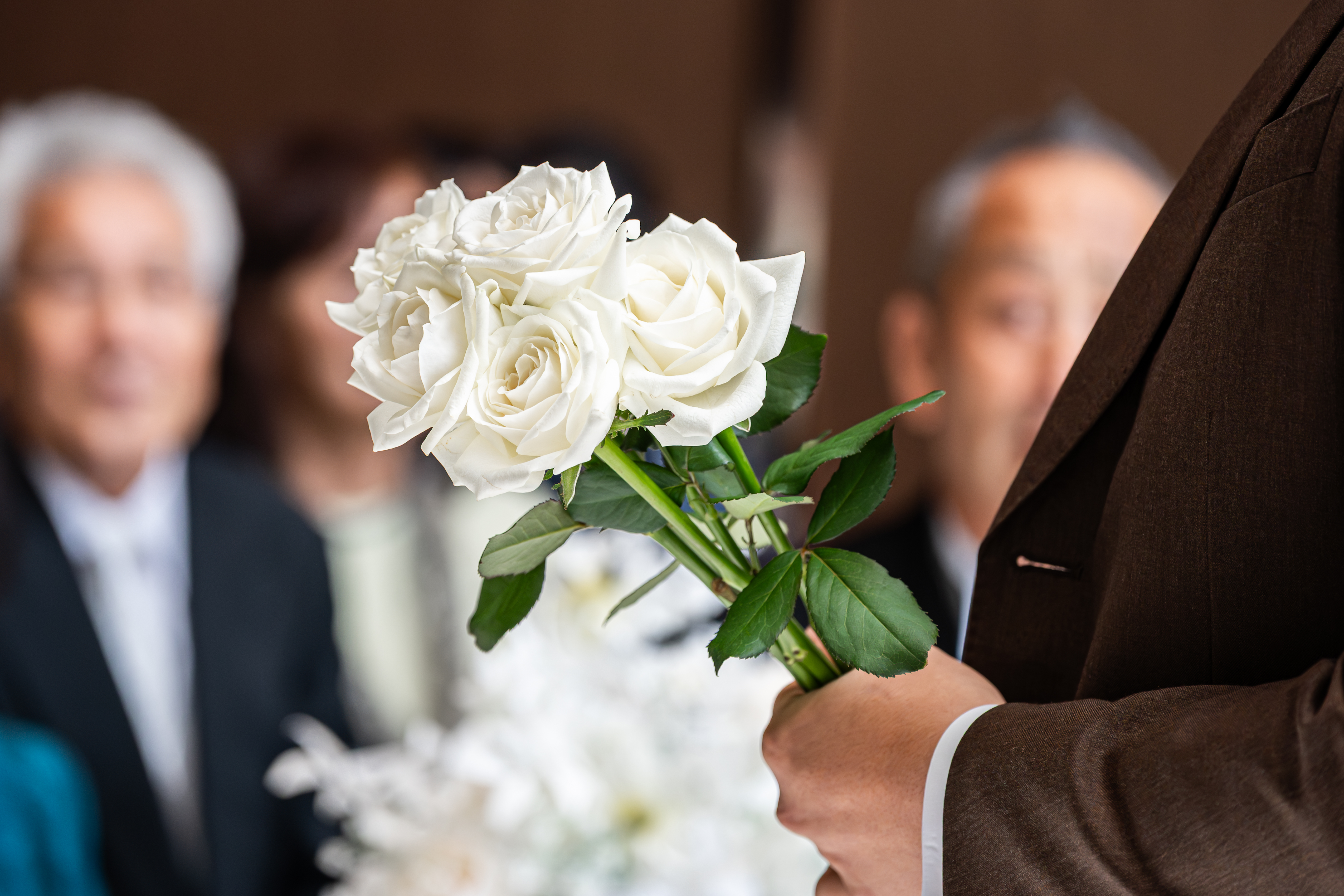 挙式時に新郎様が12名の代表の方から、12の大切な言葉とともにバラを受け取り、完成したバラの花束を新婦様に渡す、というあたたかなセレモニーです。