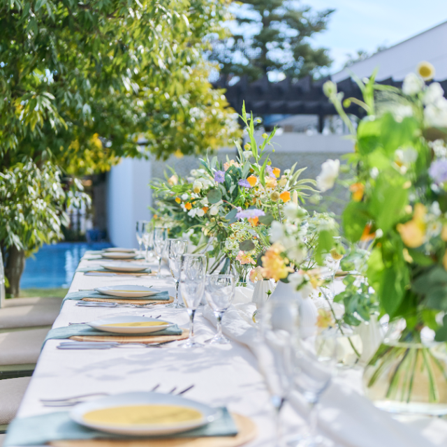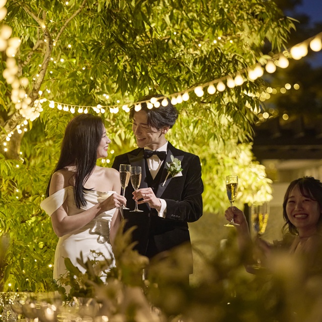 ラウンジ・テラス・バンケットと、邸宅のあらゆる場所から見渡せる開放的なアクアガーデン。一面の芝生や庭全体に広がる水面の輝き、そしてフォトスポットにもなるシンボルツリーなど、美しく整えられた空間が極上のくつろぎ感を演出します。おふたりのテーマに合わせて自由にアレンジを加え、海外ウエディングのようにリラックスしたひと時をお過ごしください。