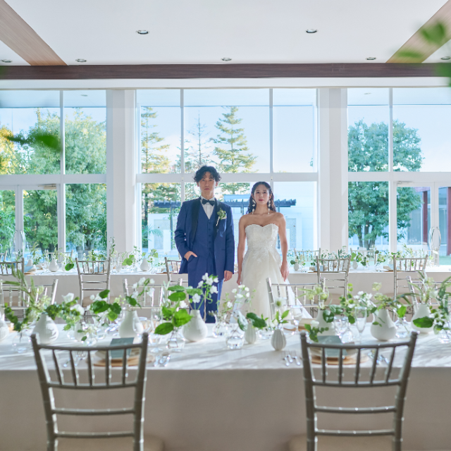 白壁と木目を基調とした、優しい雰囲気のバンケット。壁一面のガラス窓の向こうには、緑と水がきらめくアクアガーデンが広がり、まるでバンケットとガーデンが一つの空間に見えるほどの圧倒的な開放感が魅力です。どんな装飾も映えるナチュラルな空間で、おふたりらしいコーディネートやアレンジを思う存分お愉しみいただけます。