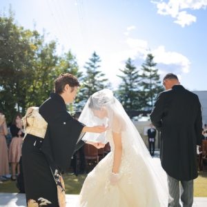 広大なガーデンと青空の元、大切な人たちの前で結婚を誓う、ガーデン人前式。