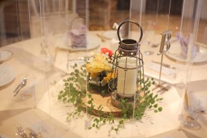テーブルにはランタンやアクセントカラーのお花を使用して