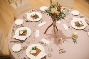 艶感のあるクロスで上質感も表現しつつ、木々やドライの花材を使って