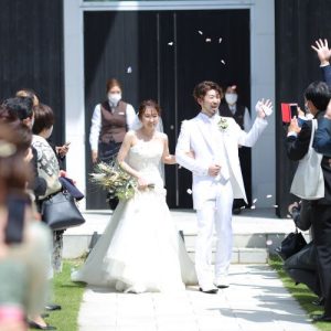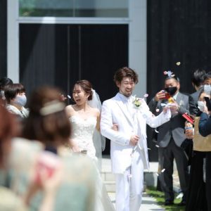 幸せいっぱいなおふたりをフラワーシャワーでお出迎え!