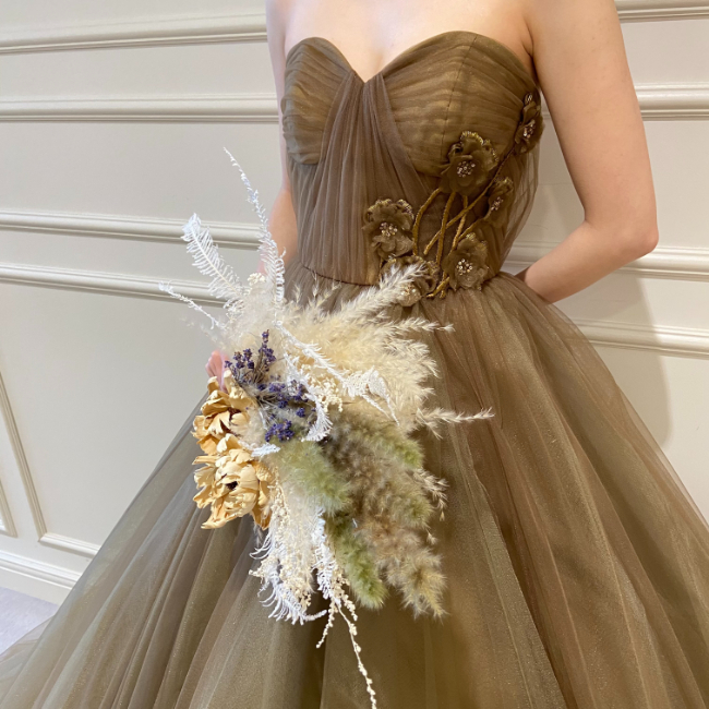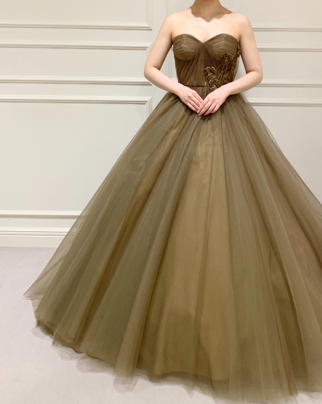 カラードレスには珍しいオリーブカラーのお洒落な1着