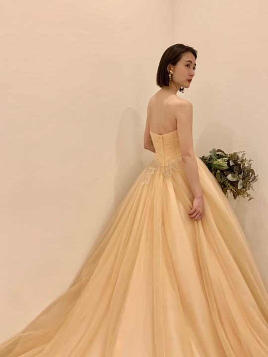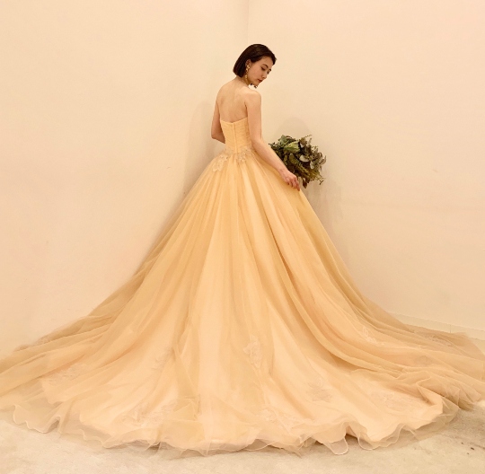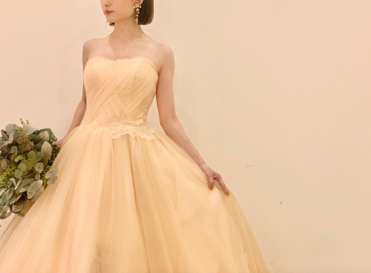 肌を艶やかに見せてくれるアプリコットのカラードレス