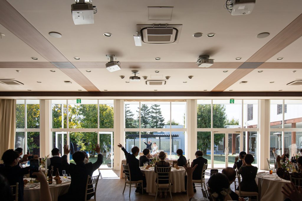カーテンが開き自然光が降り注ぐ中で披露宴がスタートいたします。