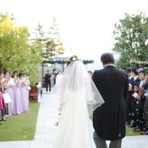 ガーデンのバージンロードを歩く新婦様とお父様。