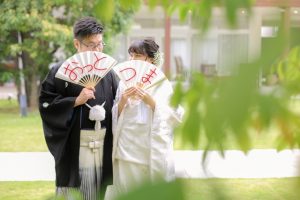 衣裳のお色味に合わせて、白い扇子に赤い糸で「おっと」「つま」と表現!