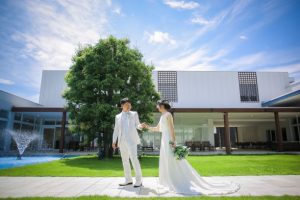 緑溢れるガーデンでの撮影はウエディングドレスとの相性もばっちり◎