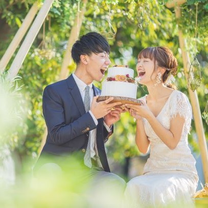 緑溢れるガーデンでの前撮り* DIYで作ったクレイケーキをもってお洒落な写真を♩ 婚式 自然体な...