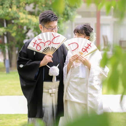 白無垢と紋付の前撮りショット♪ 衣裳のお色味に合わせて、白い扇子に赤い糸で「...