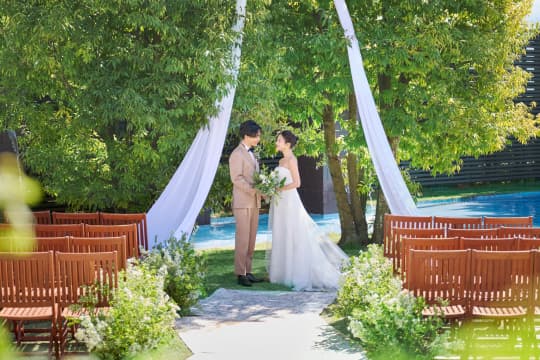 アクアガーデンでは、美しい芝生の上に広がる石造りの真っ白なバージンロードと、水上に浮かぶステージを使って、開放感あふれるガーデンセレモニーが執り行えます。まるで海外挙式のようなナチュラルな雰囲気の中、ゲストの皆様と笑顔あふれる誓いのひとときを満喫してください。