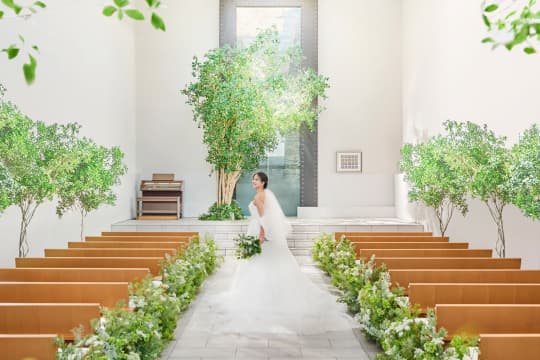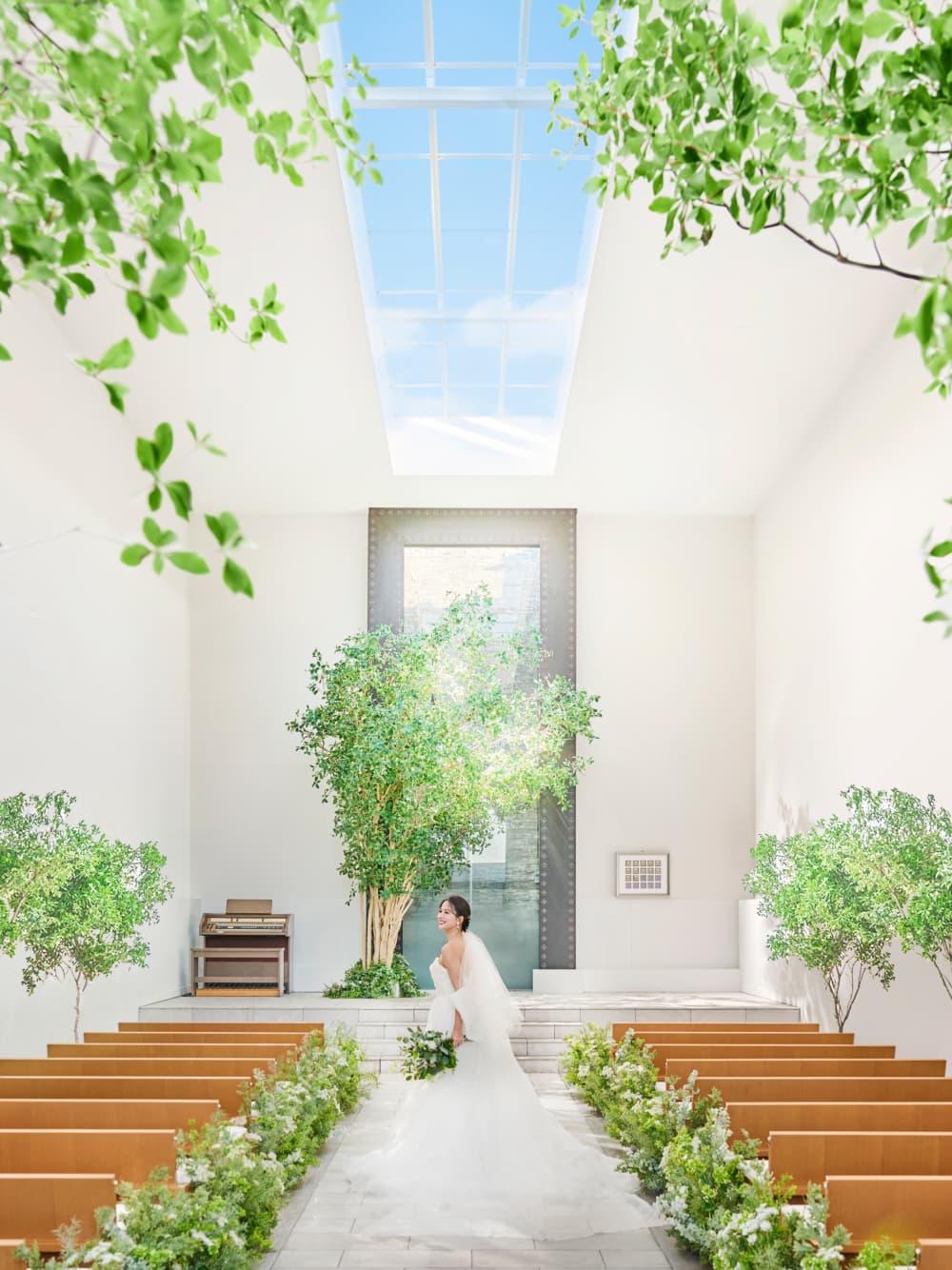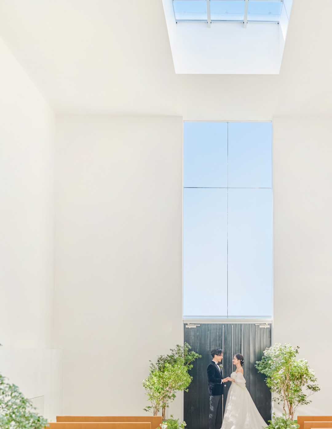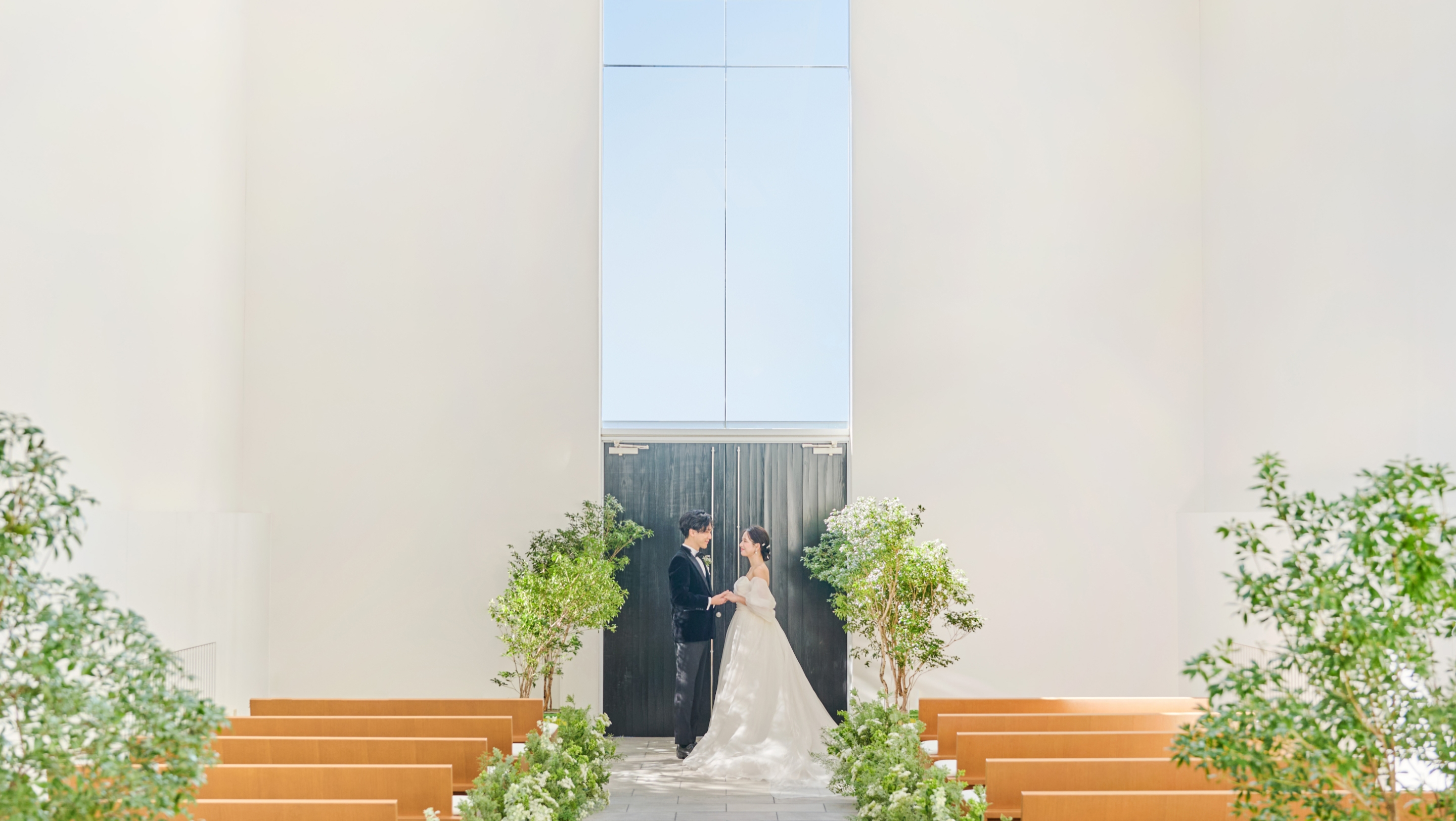 木目と白を基調にしたスタイリッシュな空間。真っすぐ伸びるバージンロードには天窓からの光が降り注ぎ、おふたりの姿を美しく照らし出します。また、祭壇の奥に流れる滝水のヴェールと水のせせらぎが優しく響き、誓いの瞬間を幻想的に彩ります。未来への誓いにふさわしい、開放感と静粛さを兼ね備えたチャペルです。