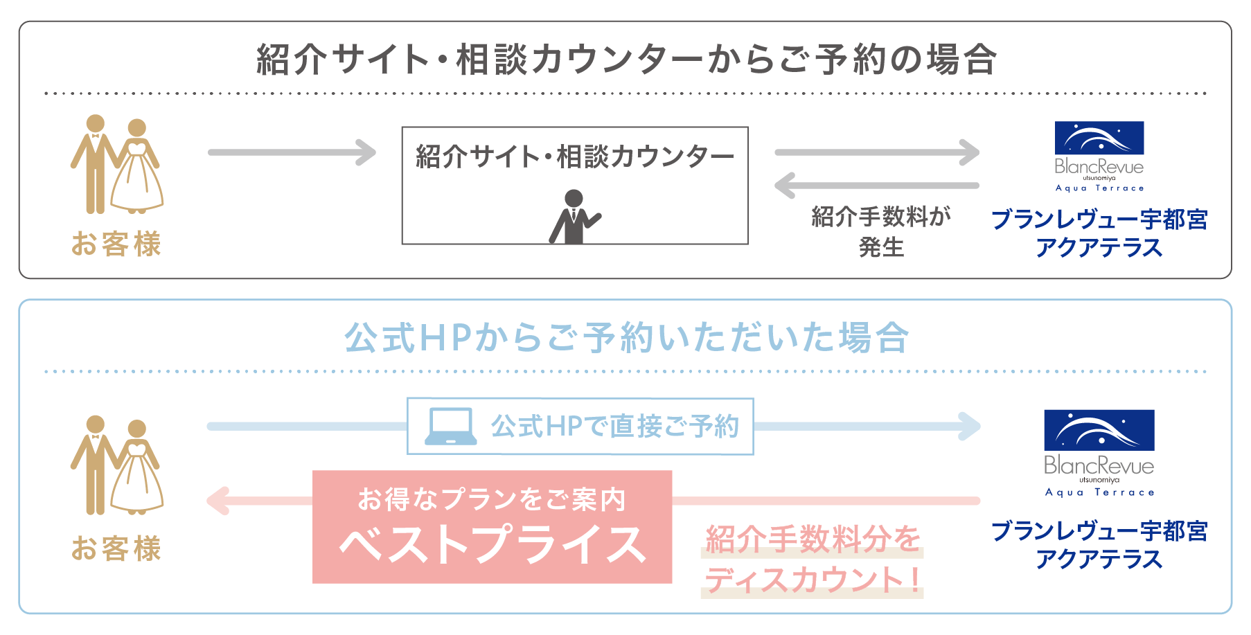 式場紹介・相談カウンターからのご予約や式場比較サイトからのご予約に比べて、当公式HPでご予約いただくと仲介手数料がかからないため、お客様に100%還元したプランをご案内することができます。