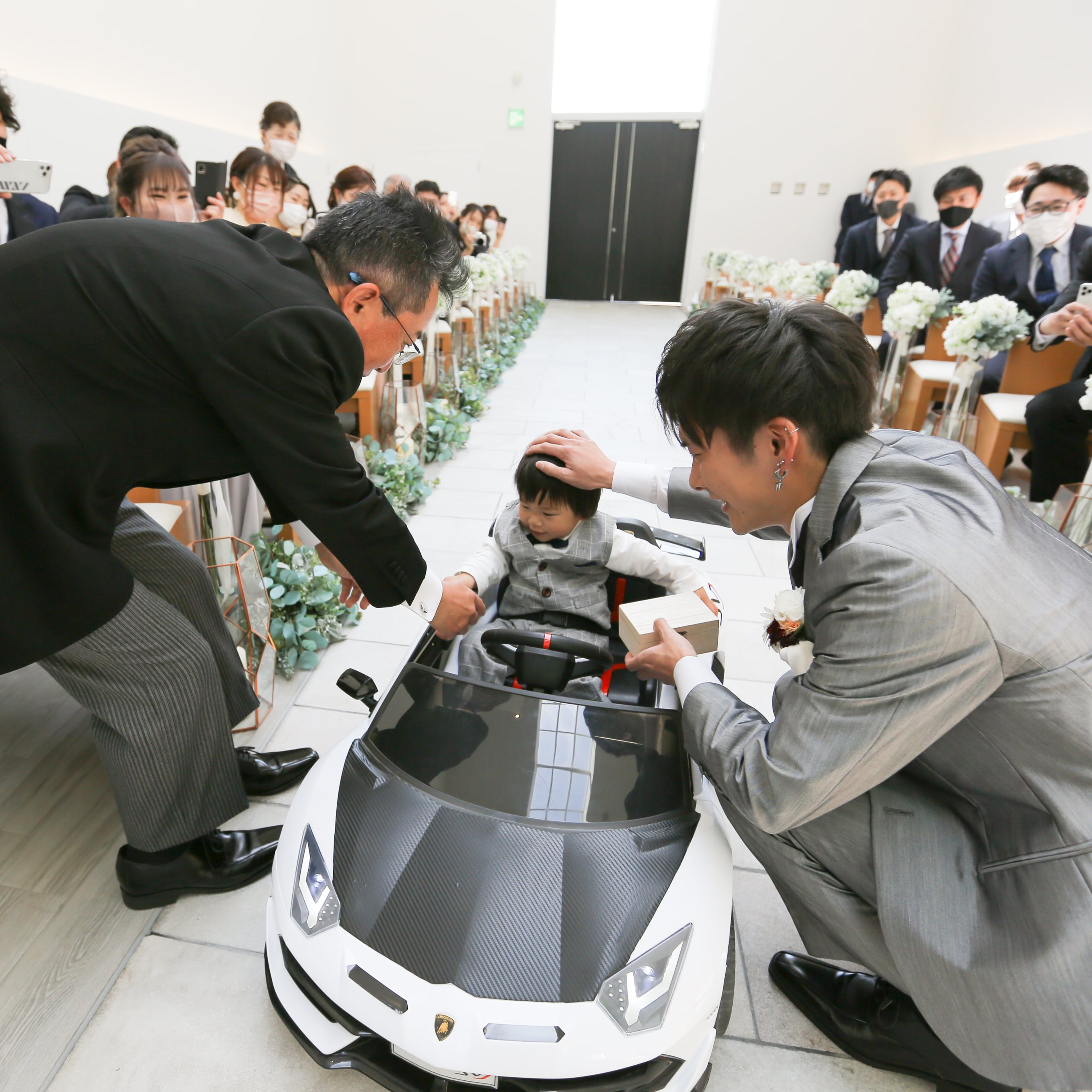 挙式ではリングボーイで指輪を届けもらうときに車に乗って登場したり、