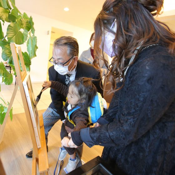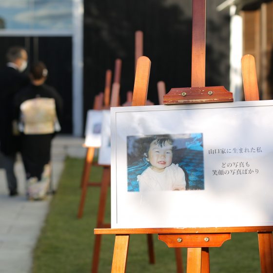 ■ペアレントタイムの前に、バージンロードに幼い頃の写真を並べ