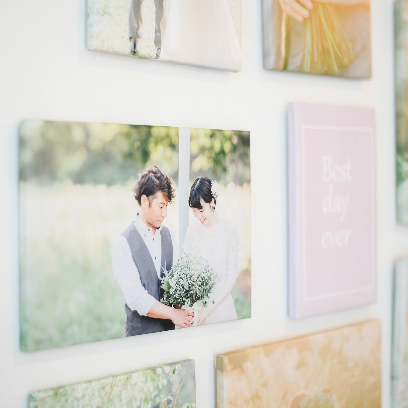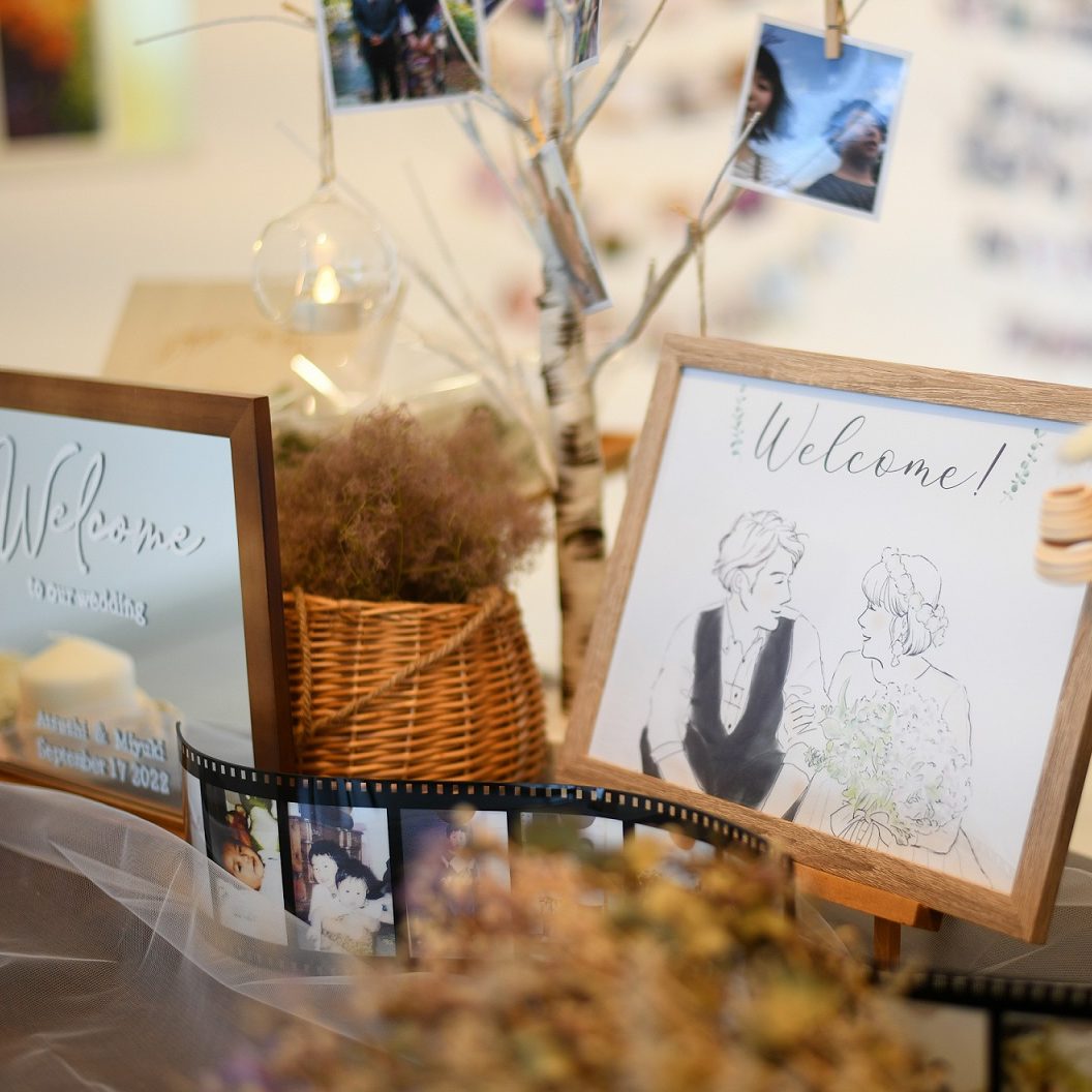 ゲストとの思い出の写真やふたりの前撮りの写真を飾って、