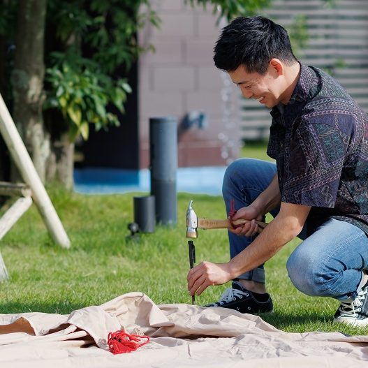 ガーデンにはテントを設営し思い出が詰まったキャンプグッズを飾りました。